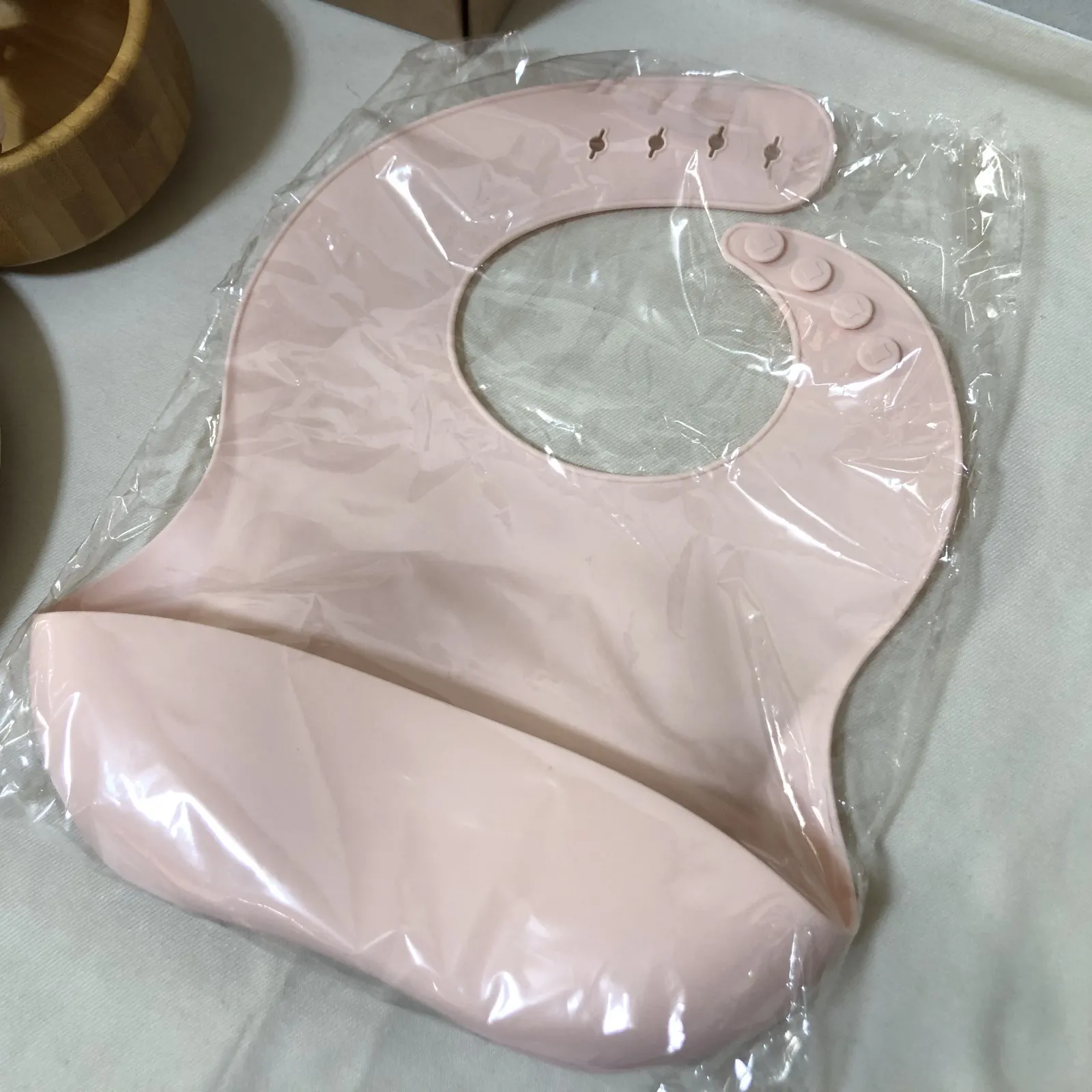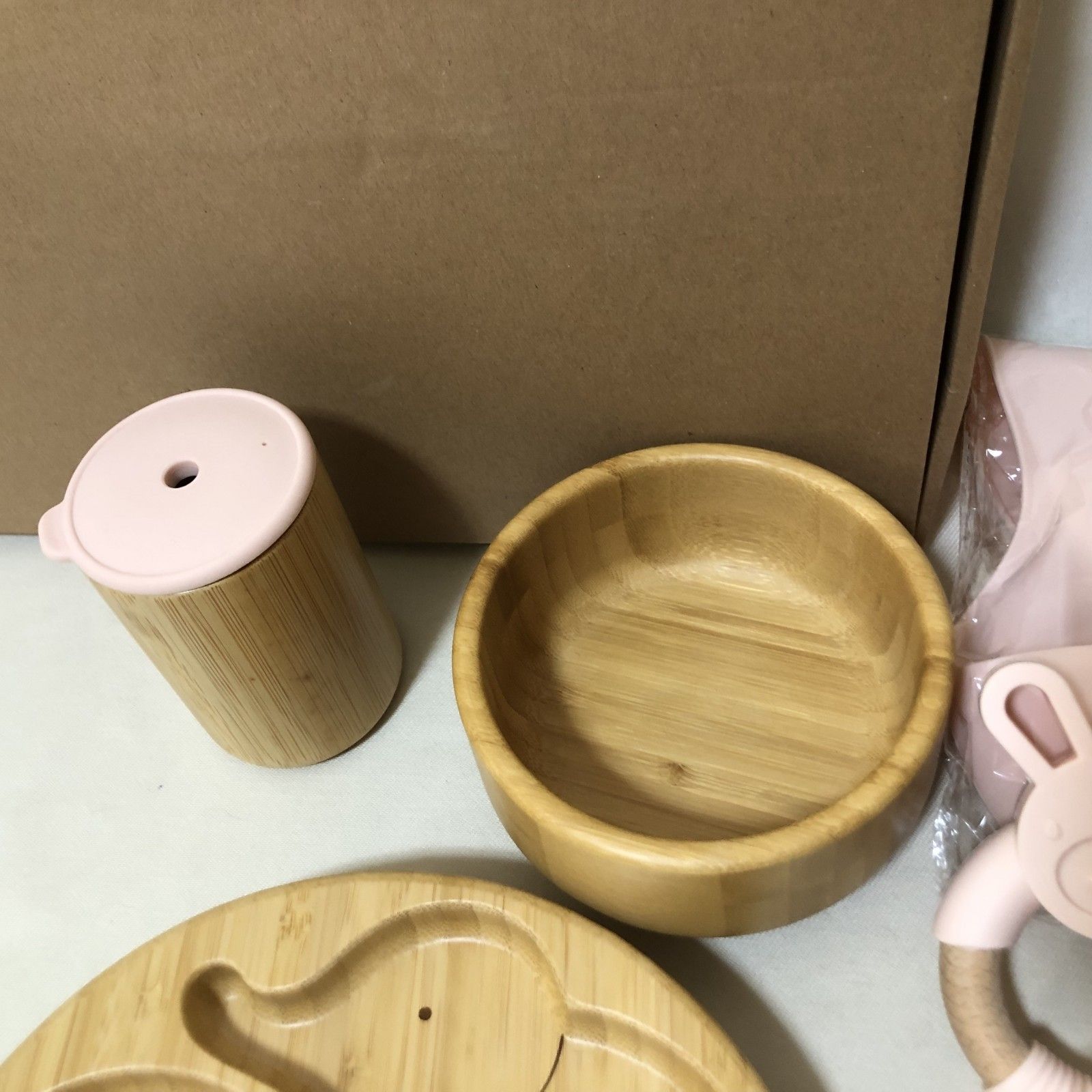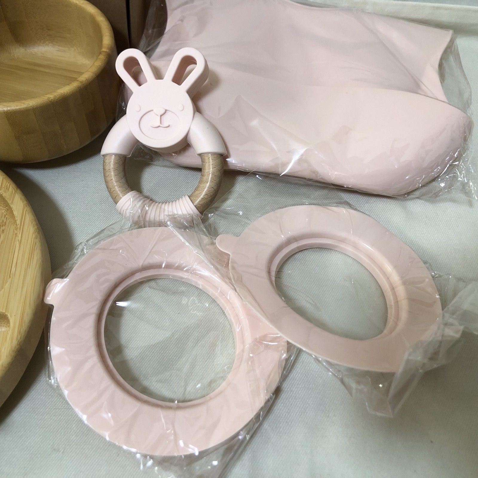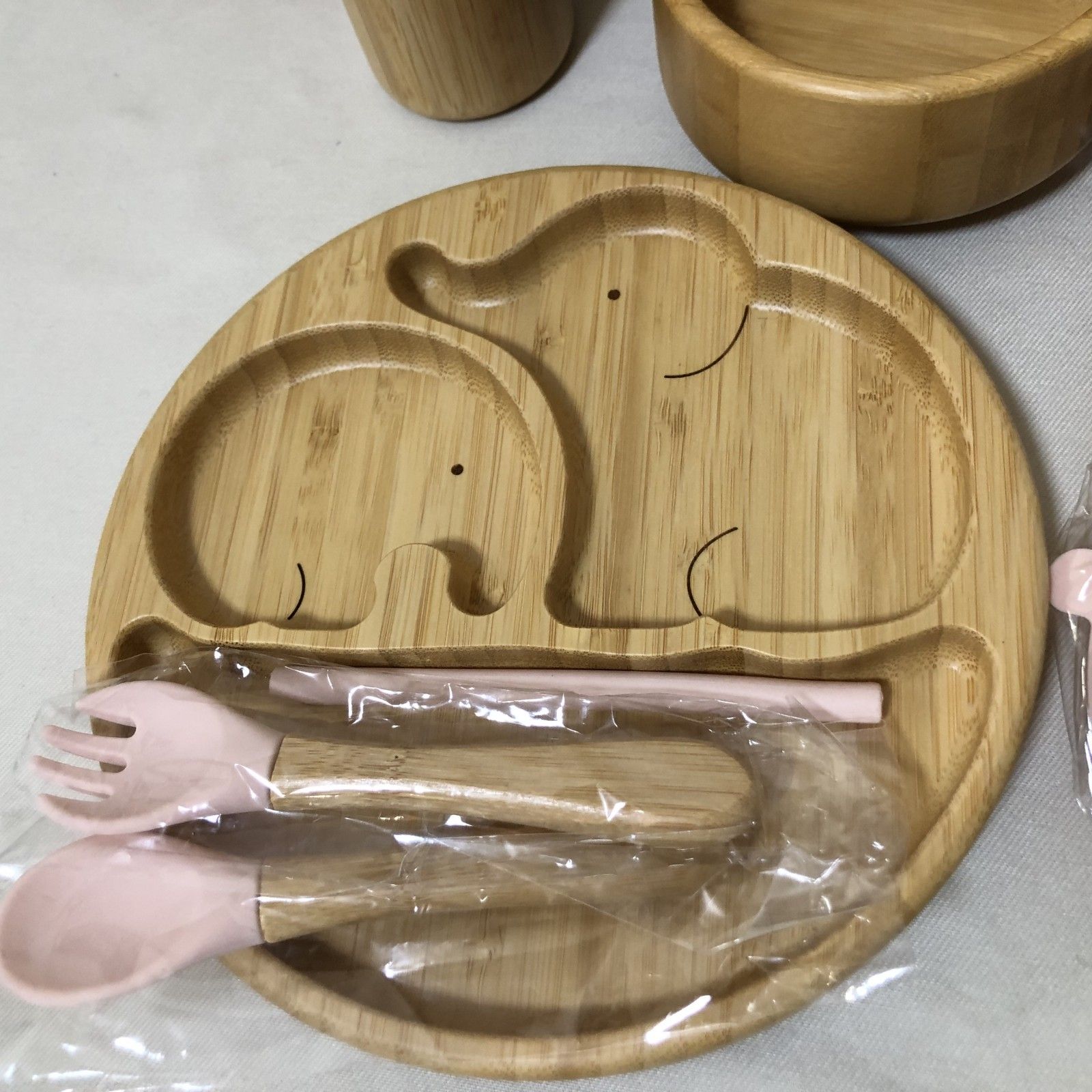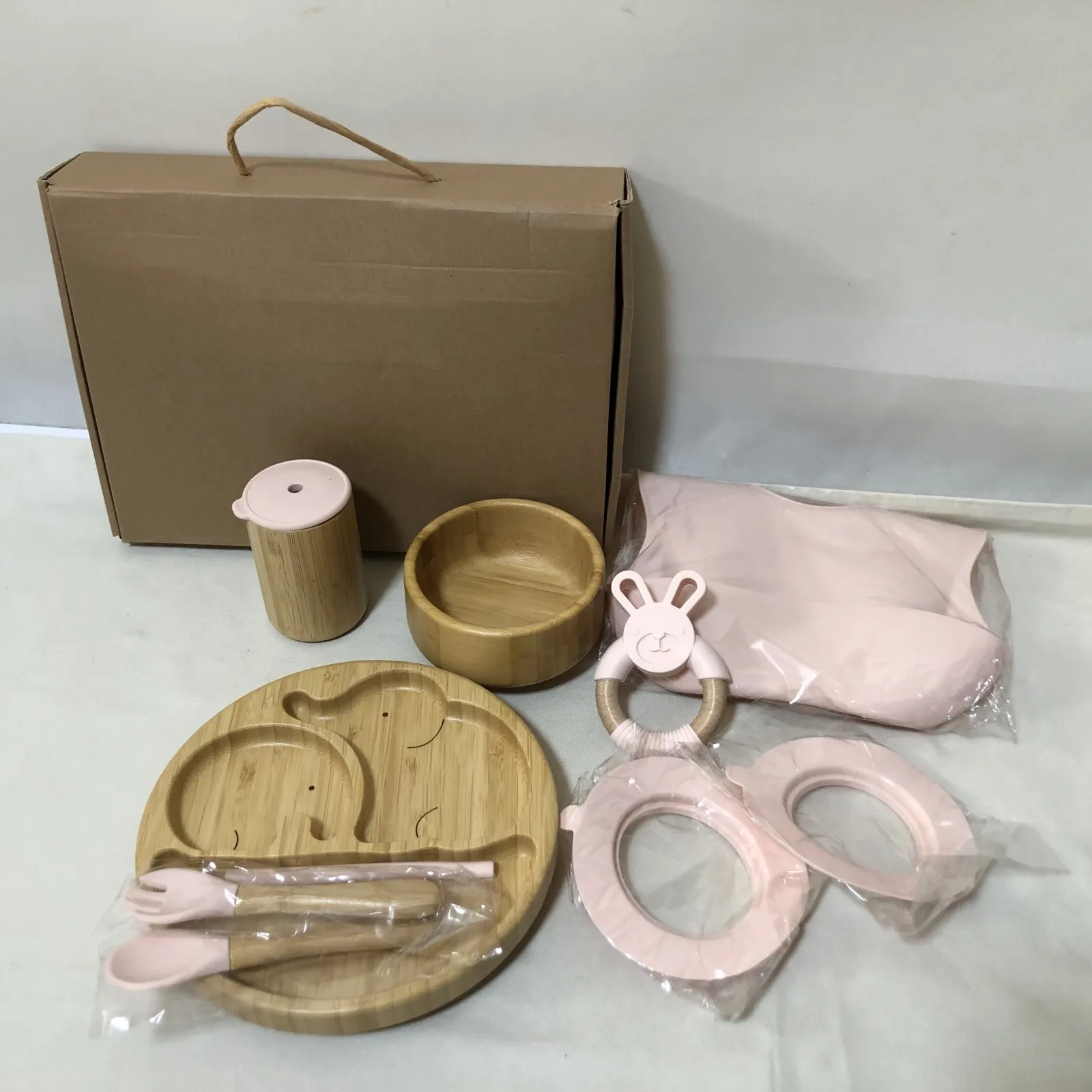 H701 新品 ベビー食器セット 木製 プレート エプロン フォーク スプーン ピンク 女の子 出産祝い ギフト
