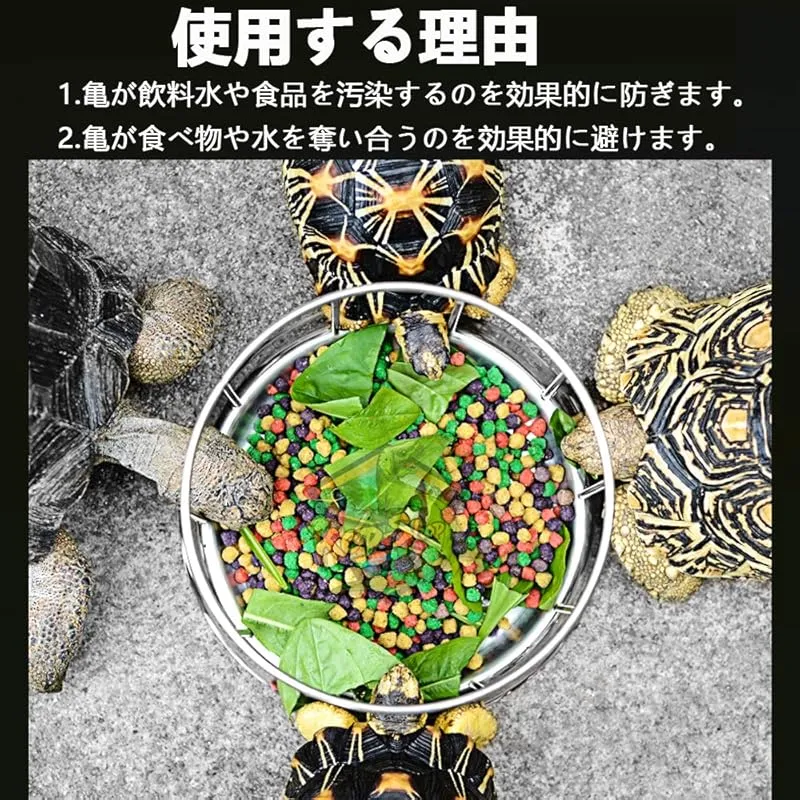 【使用理由】ほとんどのカメは、足で食べたり、体全体を餌の上に乗せて食べることを好むため、餌を汚しやすく、浪費の原因にもなります。このフードボウルはこの問題の良い解決策です。ステンレス製の柵と突出した中間部は、餌の競合を避け、科学的な給餌ができるように設計されています。