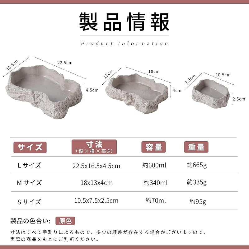 【3 サイズ科学的に分級、ペットの体型に正確にマッチ】 S サイズ(約 10.5×7.5×2.5cm):ヤモリ、幼亀、小型クモ専用 M サイズ(約 18×13×4cm):ツノガエル、成体トカゲ、ヤドカリに適し L サイズ(約 22.5×16.5×4.5cm):陸亀、半水棲亀、複数ペットで共用可能な水域 層別化されたサイズにより空間の無駄を省き、あらゆる種類のペットが快適に使用できるようにしています。