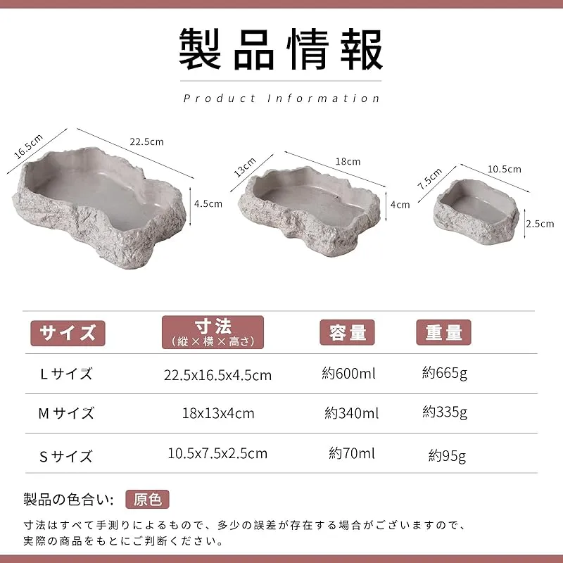 爬虫類のためのマルチパーパスフィーディングボウルセットです。耐久性の高いポルトランドセメント製で、水入れ、餌入れ、浴槽として多目的に使用できます。 自然な岩石のような質感と層状の表面デザインで、爬虫類の生息環境に調和します。内壁が滑らかで清掃が簡単、食器の汚れが残りにくい設計です。 Lサイズ(22.5×16.5×4.5cm、容量約600ml)、Mサイズ(18×13×4cm、容量約340ml)、Sサイズ(10.5×7.5×2.5cm、容量約70ml)の3サイズをご用意。水硬性と強度が安定しており、耐圧性と耐久性に優れています。自然な色合いで、爬虫類用テラリウムの雰囲気を損ねません。 ※寸法は手測りのため、実際の商品と若干の誤差が生じる場合がございます。