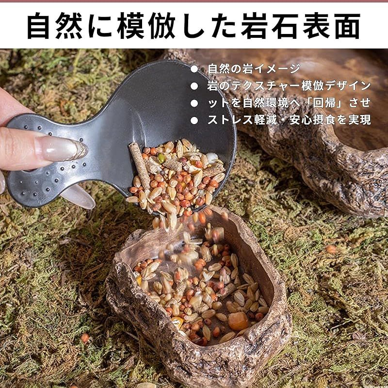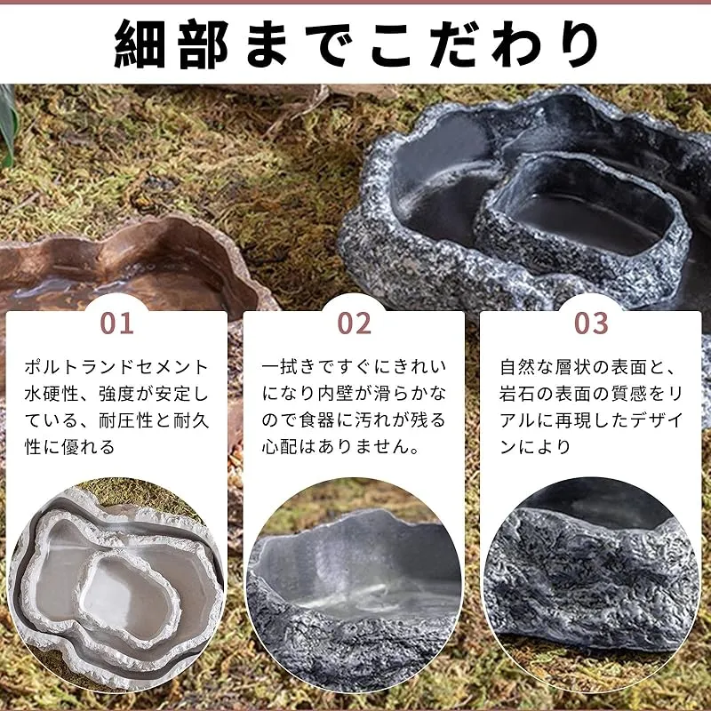 【安定性と耐久性に優れ、生態に溶け込むデザインで飼育体験を向上】 高密度セメント素材を使用し、噛み付きに強く腐食にも強い。底面が広く上部が狭い構造で転倒を防ぎます。自然の原色調で熱帯雨林、砂漠などの造景テーマにシームレスに溶け込み、実用性と美観を両立させ、飼い主が布置の楽しみを享受できるようにします。