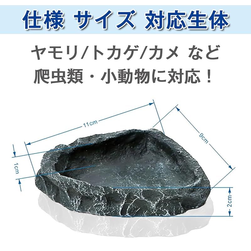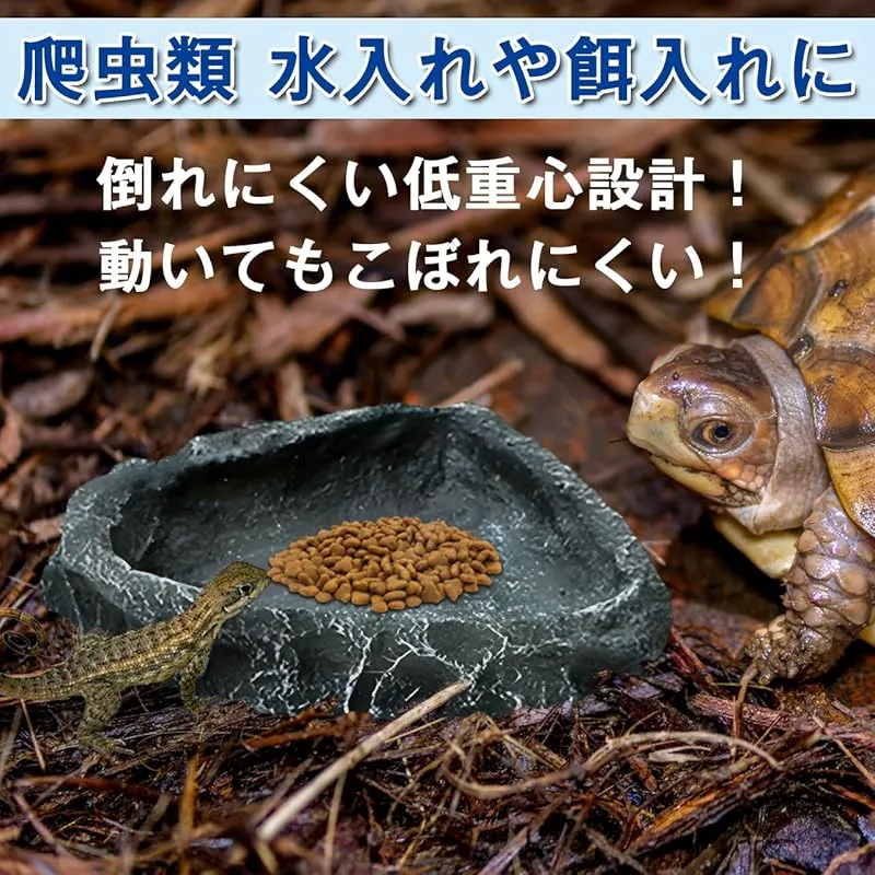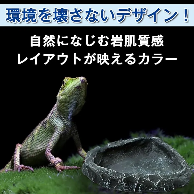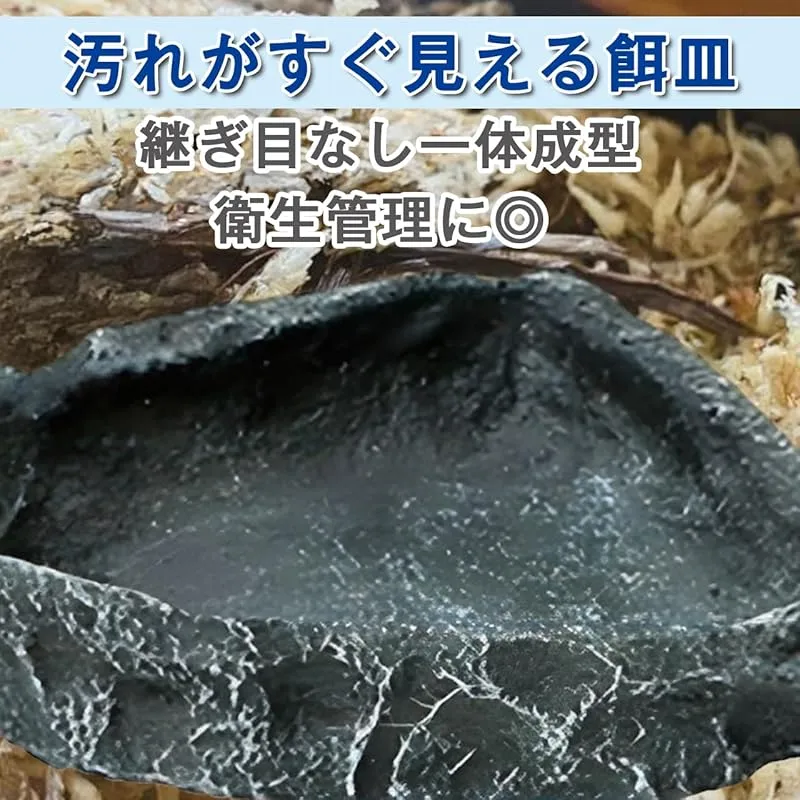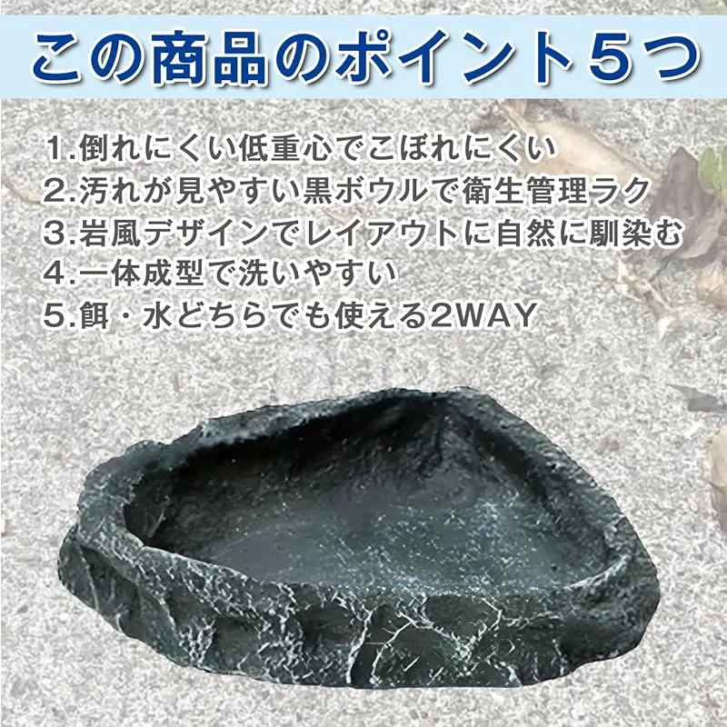 リアルな岩の風合いを持つ、黒色の『安定設計ロックディッシュ』ひっくり返りにくい低重心 底面積を広く、重心を低く設計することで、生体が登ったり、活発に動いたりしても簡単に倒れにくい安定性。ケージ内の水濡れリスクも減らします。幼体も安心な浅すぎず、深すぎない水深設計で、小型でも水飲みができます。 ボウル内が黒色のため、水に浮遊・沈殿した白いフンや食べ残し、床材の破片などが、底面とのコントラストにより発見しやすく、水の汚れをいち早く察知できます。継ぎ目のない一体成型構造でお手入れしやすく、丸洗いが簡単です。※ヌメリは目視が難しいため、水をこまめに替えて衛生を保持してください。 天然の岩石に近い質感と黒色で、ケージ内のレイアウトに自然に溶け込み美観を向上させます。樹脂を使用しており、耐久性にも優れています。 このロックディッシュは、水を入れるウォーターディッシュとしてだけでなく、乾燥フードやサプリメント用のえさ皿としても便利にご利用いただけます。 省スペースサイズ 場所を取らないコンパクトなサイズ設計です。小型の飼育ケージや、限られたスペースでもレイアウトの邪魔になりません。水入れと餌入れどちらでもご使用いただけます。