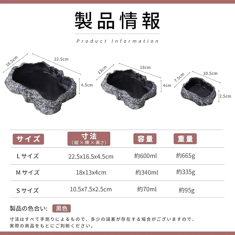 【3 サイズ科学的に分級、ペットの体型に正確にマッチ】 S サイズ(約 10.5×7.5×2.5cm):ヤモリ、幼亀、小型クモ専用 M サイズ(約 18×13×4cm):ツノガエル、成体トカゲ、ヤドカリに適し L サイズ(約 22.5×16.5×4.5cm):陸亀、半水棲亀、複数ペットで共用可能な水域 層別化されたサイズにより空間の無駄を省き、あらゆる種類のペットが快適に使用できるようにしています。