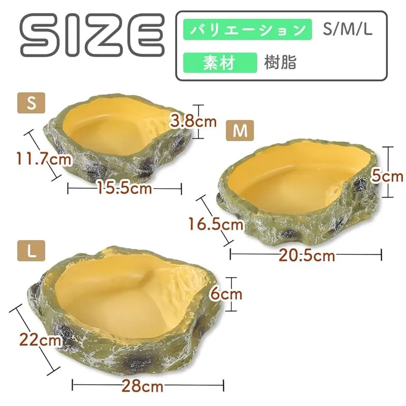 蛙やトカゲなど爬虫類や両生類を主としたペットに最適なフードディッシュ。水飲み場としても設置可能で、自然界の環境に近く溶け込みやすい、岩や土を思わせる樹脂製の容器です。適度な重さが備わった安定感のある容器なのでひっくり返しにくく、飼い主の不在中に餌と水不足を回避できます。365日、生物にとって常に必要なものが揃った快適な環境で飼育出来ます。容器が深過ぎないので生物が溺れる心配がなく、対象生物に合ったお皿のサイズを選ぶことが出来ます。水浴びをする池の代わりにもなり、皮膚の潤いで脱皮のサポートにも役立ちます。材質:樹脂、Lサイズ:28x22x6cm