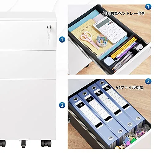 【引き出し3段フルオープン】引き出しが3段付き、用途で使い分けられるので細かいファイル整理が可能。1段目には、ペントレ付き、細かい文具も綺麗に収納できます。3段目は、A4ファイルがすっぼり納まります。効率よく整理できる同時に、充分な作業スペースも保証します。