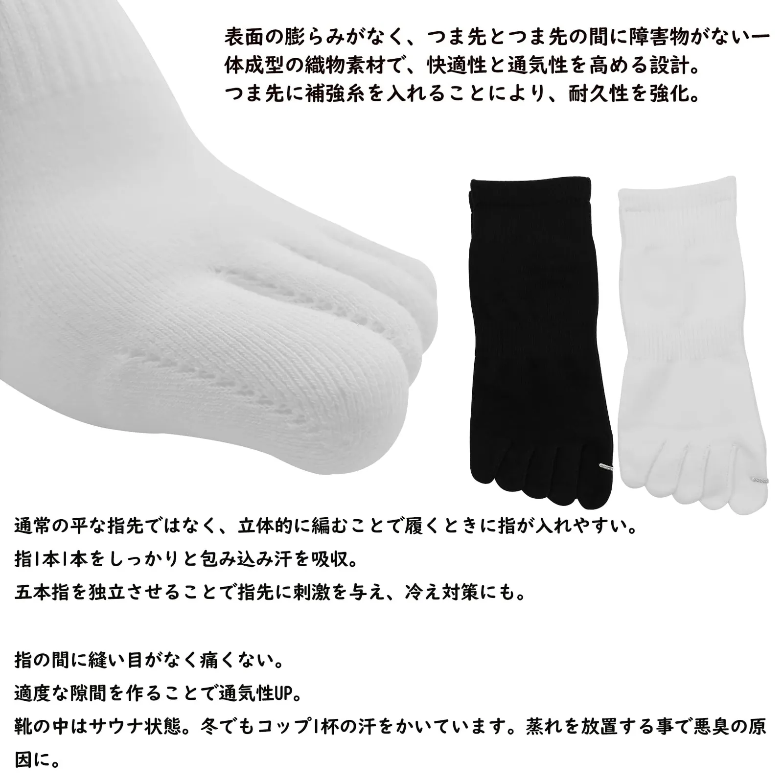 【優れたデザイン】:従来の5本指ソックスとは異なり、立体的に編まれた5本指、通常の平な指先ではなく、立体的に編むことで履くときに指が入れやすい。清掃するときは洗濯機で洗うか手洗いをする。