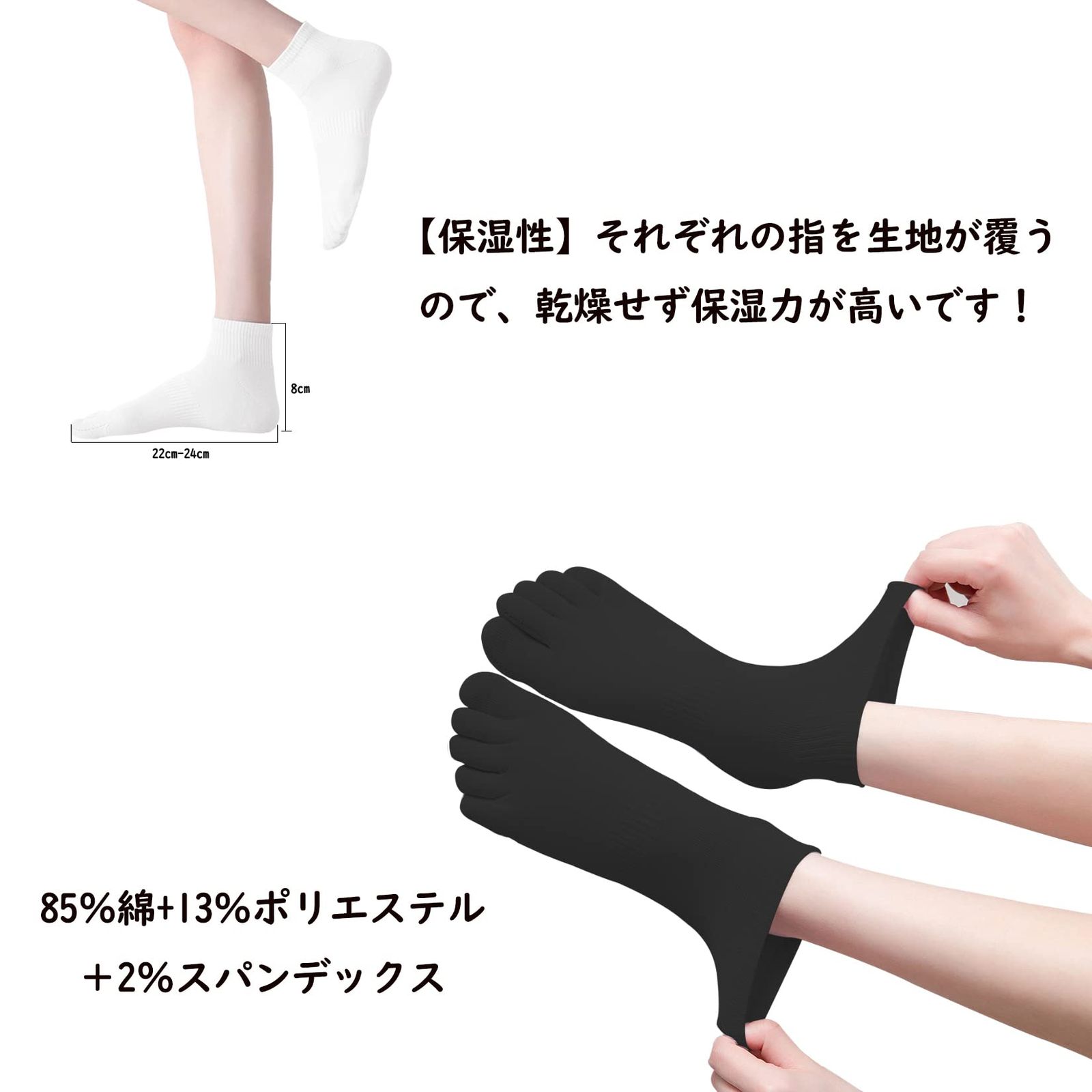 【五本指】同色5足セットです、サイズ:22-24cm、置き寸サイズ:履き口~かかと:約10.0cm。伸びるソックスですので足にフィットします、5本の指部分がそれぞれ独立しており、水虫の予防に助かります。また足指のバランスを正常化し、外反母趾と扁平足の予防効果があります。