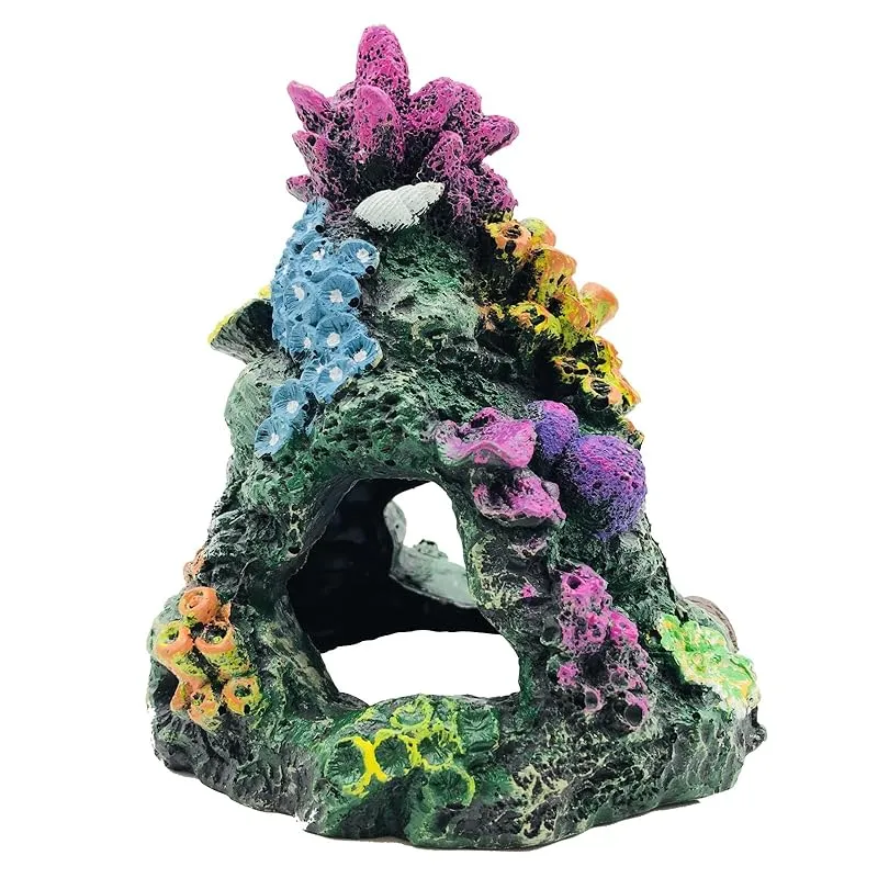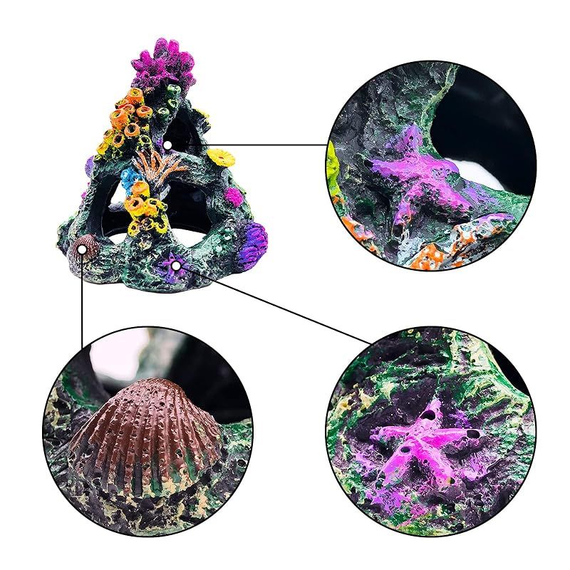 【頑丈な一体構造】この樹脂製サンゴ礁は一体構造で設計されており、壊れにくいのが特徴です。サンゴ礁の上には装飾としてイソギンチャクとヒトデが配置され、アクアリウムに鮮やかな彩りを添えます。