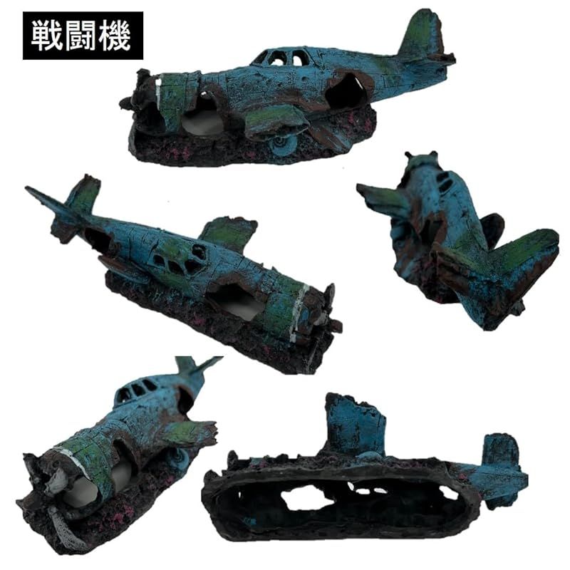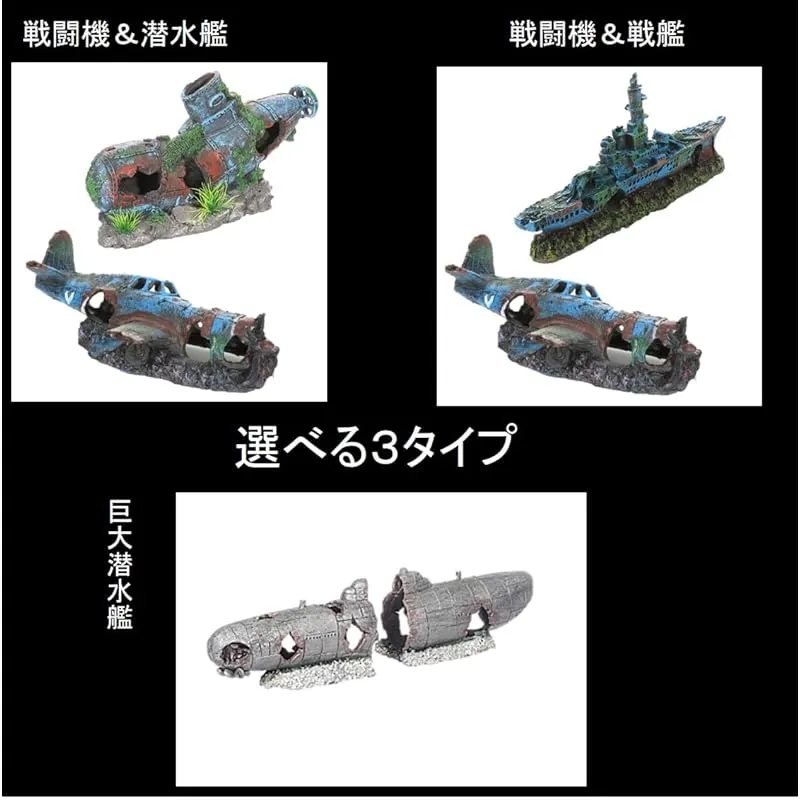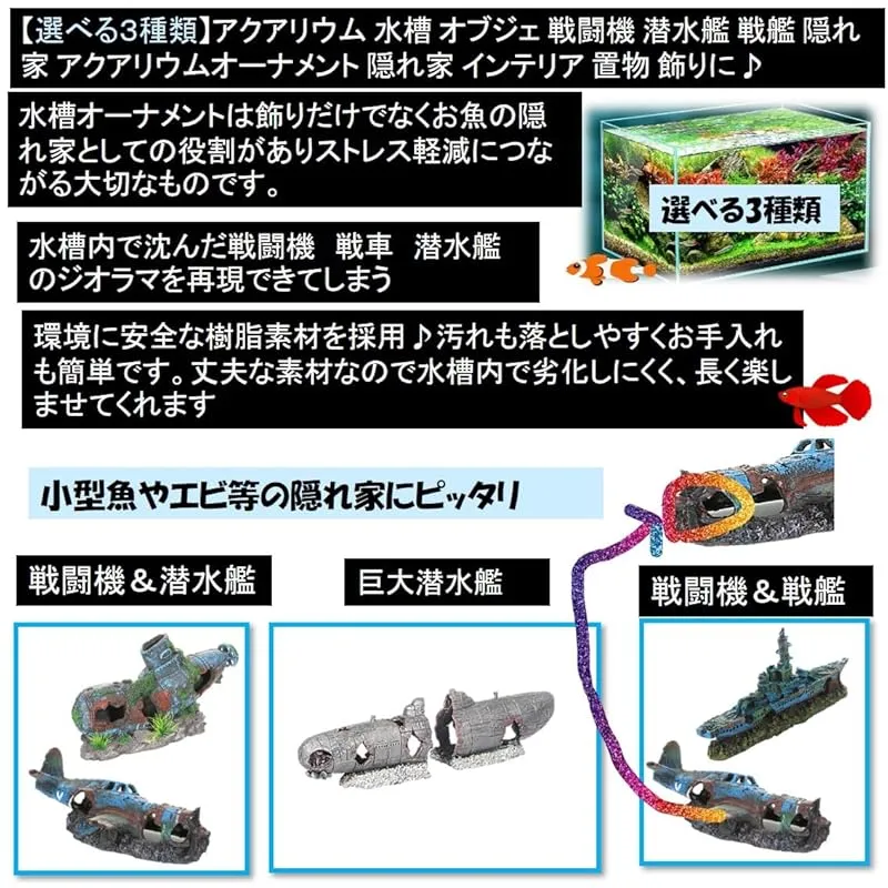 【選べる4種類】アクアリウム 水槽 オブジェ戦闘機 潜水艦 戦艦 隠れ家 アクアリウムオーナメント 飾り 熱帯魚 爬虫類 海水魚 金魚 メダカのレイアウト素材としてお使いください♪