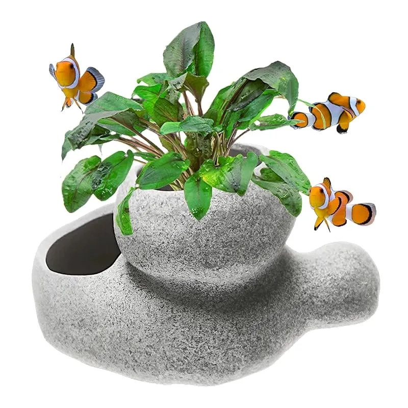 【水槽オブジェにもなる水草ポット】穴の空いた丸石をモチーフとした水草用の鉢です。水槽用の水草ポットでありながら、自然な雰囲気の水槽レイアウトを演出するのに最適なアクアリウムオーナメントです。