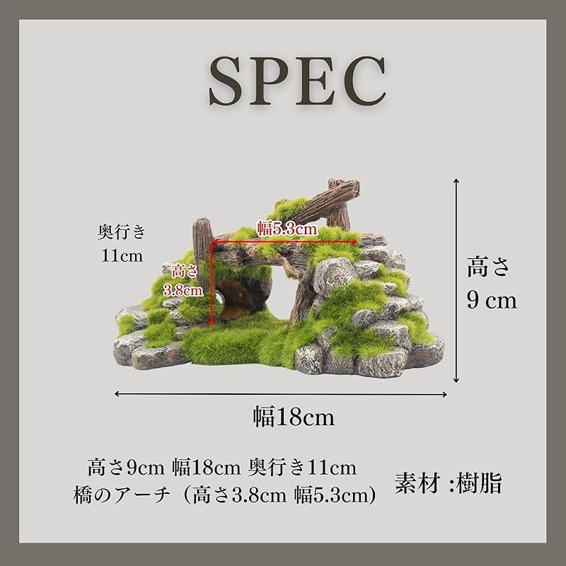 リアルな苔むし石と流木風の橋のオブジェで自然感を演出:アンティーク調の石と木の橋が苔で覆われたデザインで、水槽内に本物さながらの自然な風景を作り出します。魚たちに癒しの空間を提供し、観賞用の水槽を一段と美しく引き立てるアクアリウムの置物です。