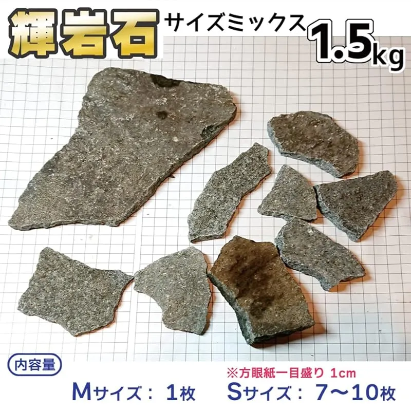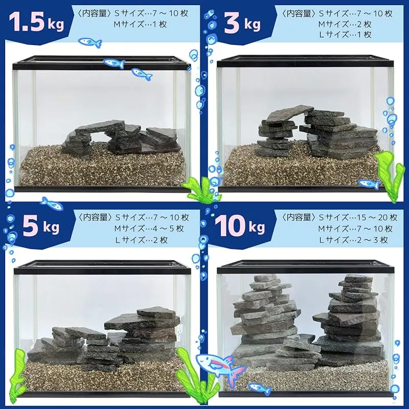 輝岩石1.5kgセットです。積み重ねるだけで誰でも簡単にダイナミックなレイアウトが完成します。 内容量はMサイズ1枚、Sサイズ7~10枚程度を目安にしてください。