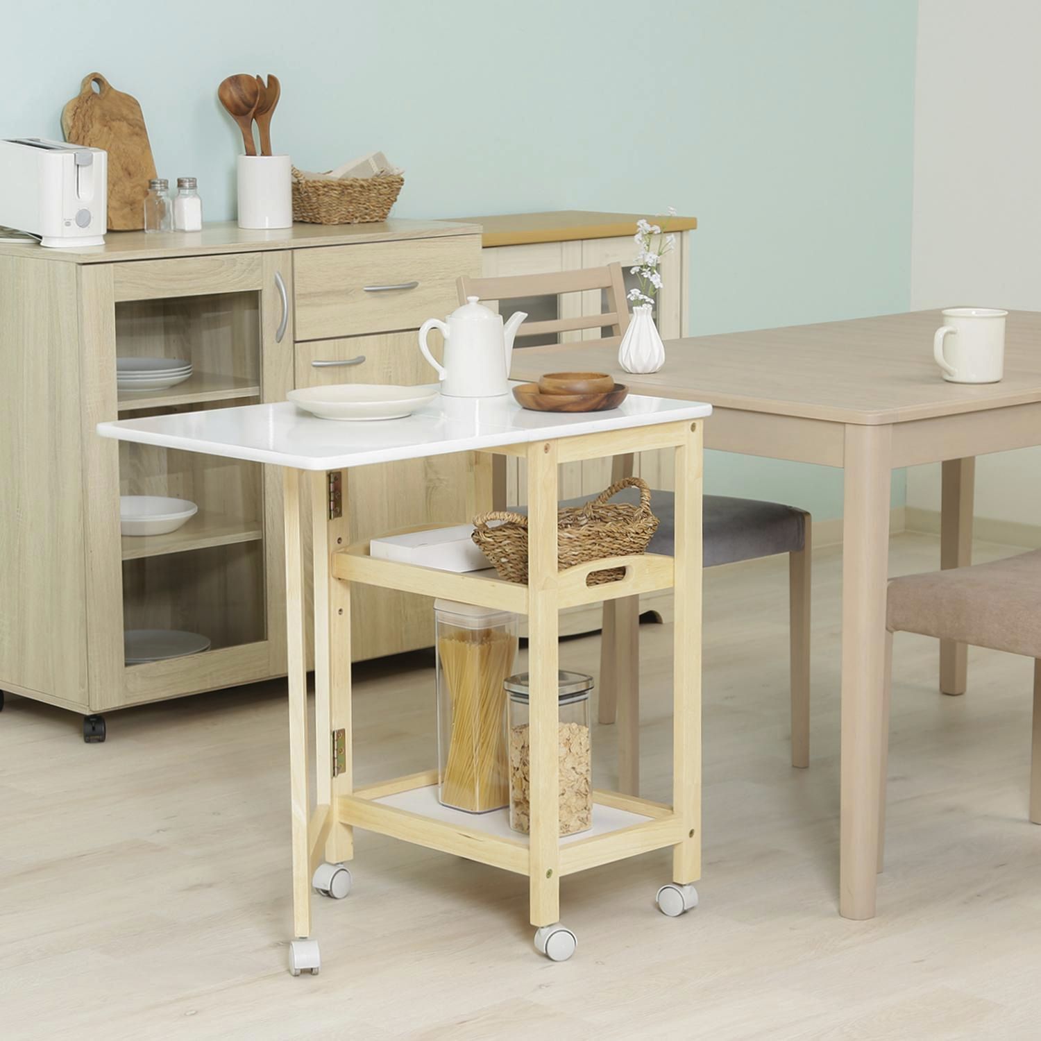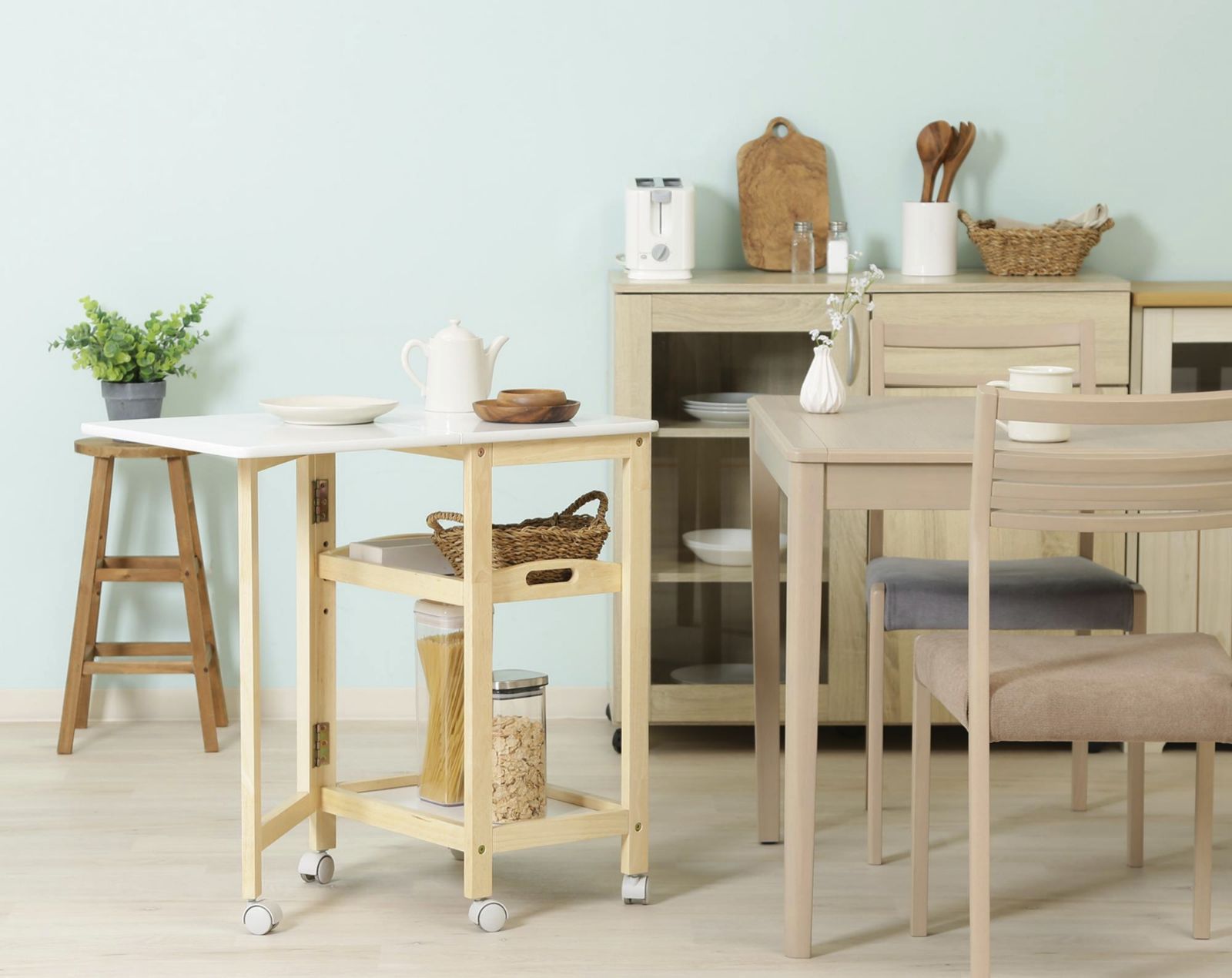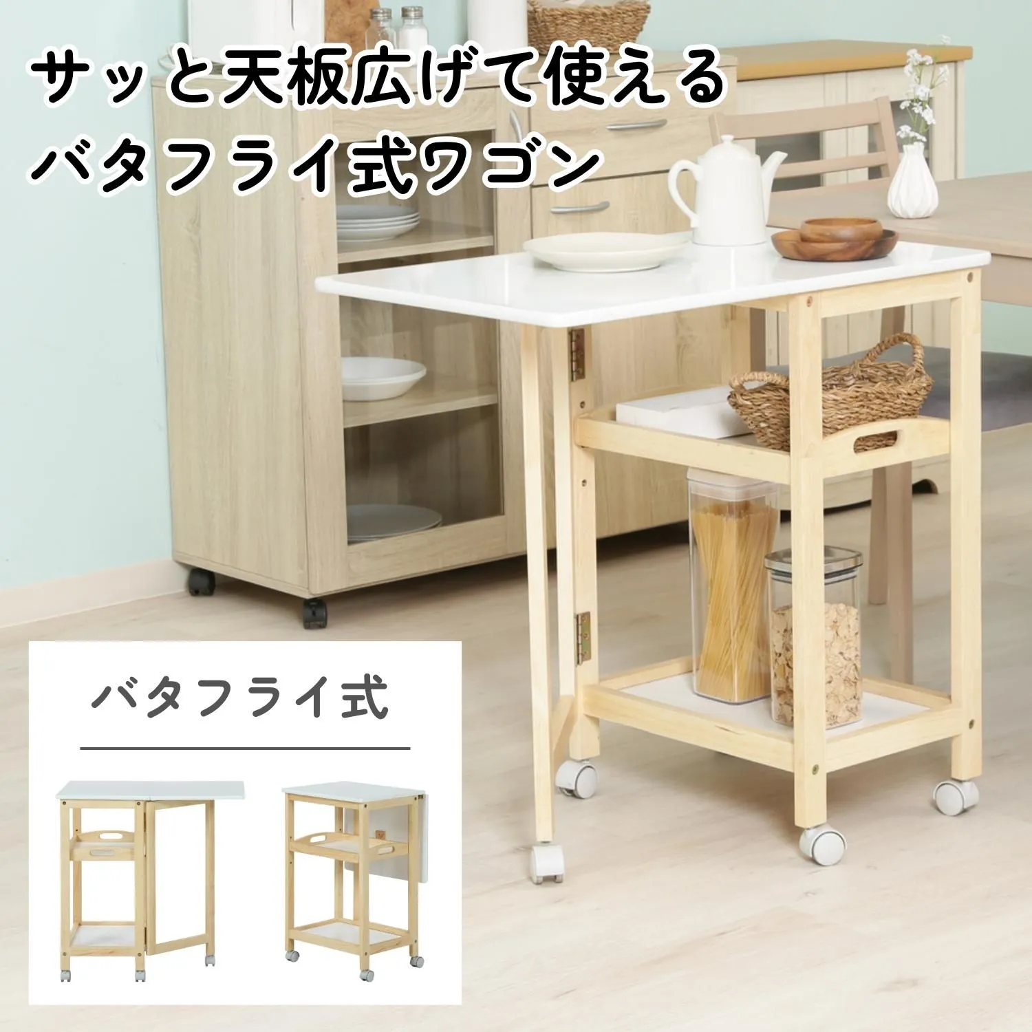 キッチンに1台あったらとっても便利! ナチュラルテイストのキッチンワゴンです♪ *バタフライ天板で使用スペースの調節可能 *UV塗装で傷に強い天板 *組み立て商品