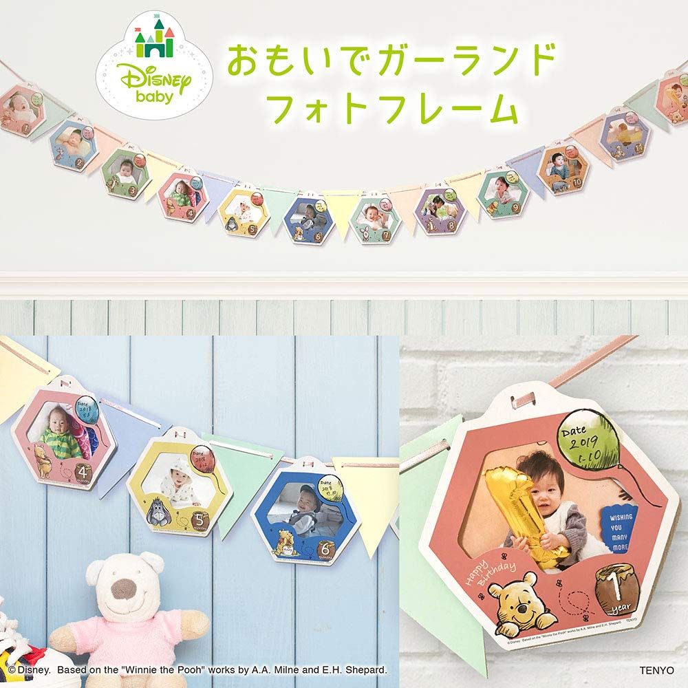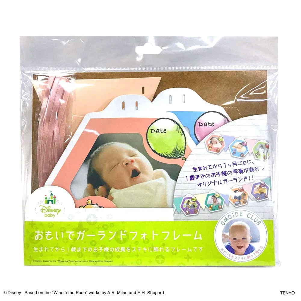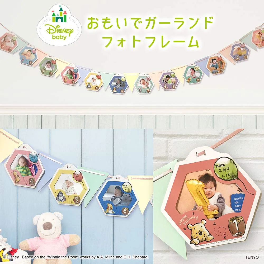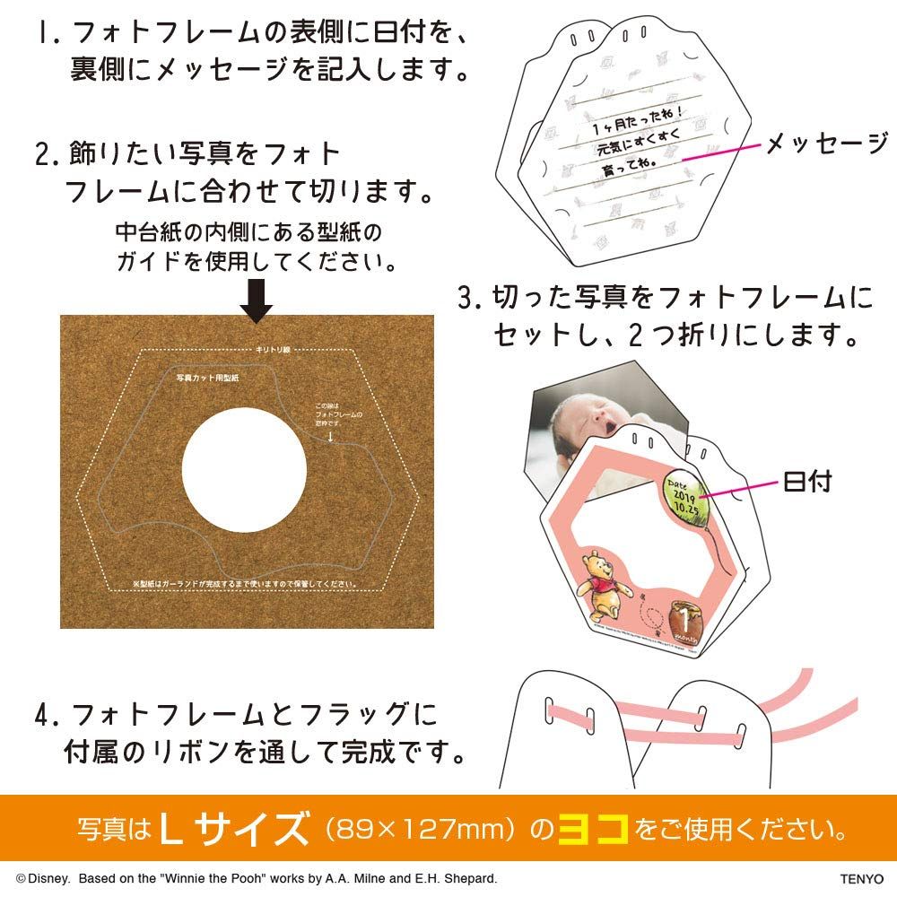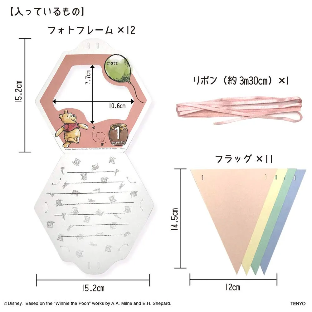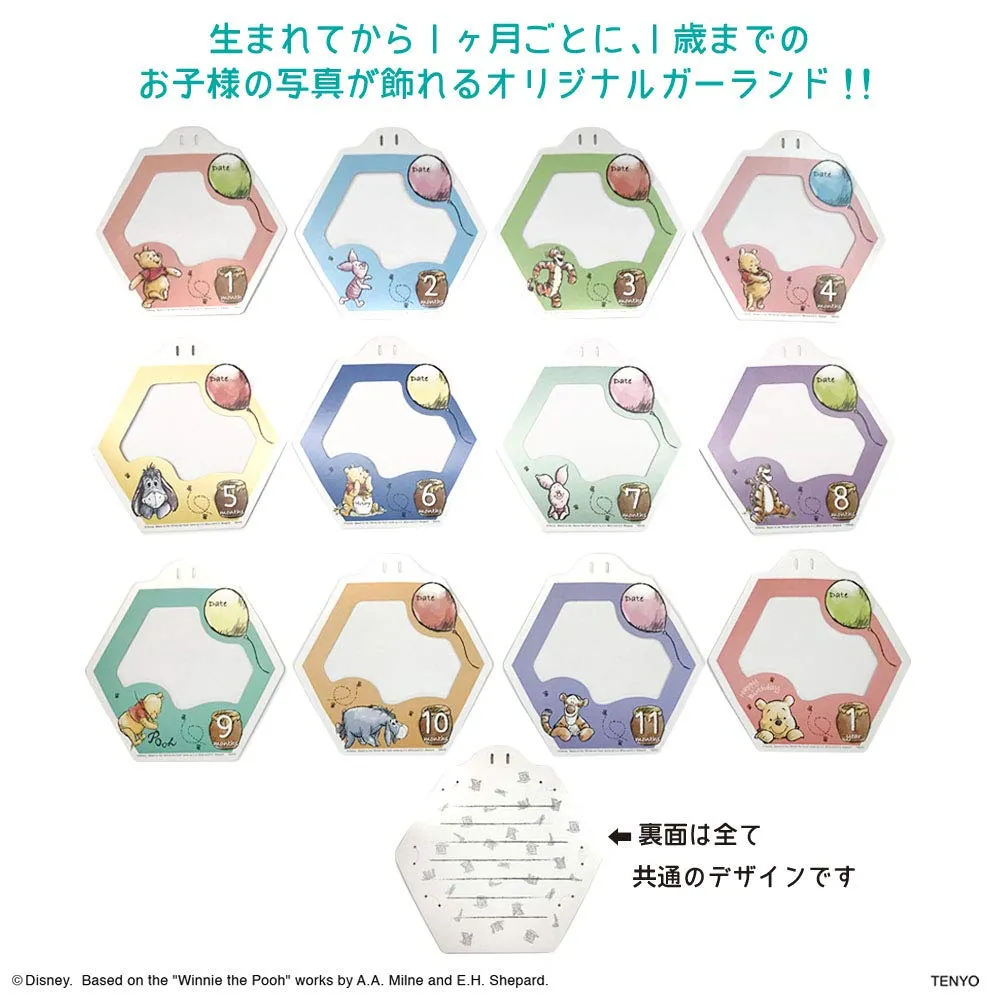 生まれてから1か月ごとに1歳までの写真を入れて、付属のリボンに旗と一緒に通せばオリジナルのガーランドが作れます。