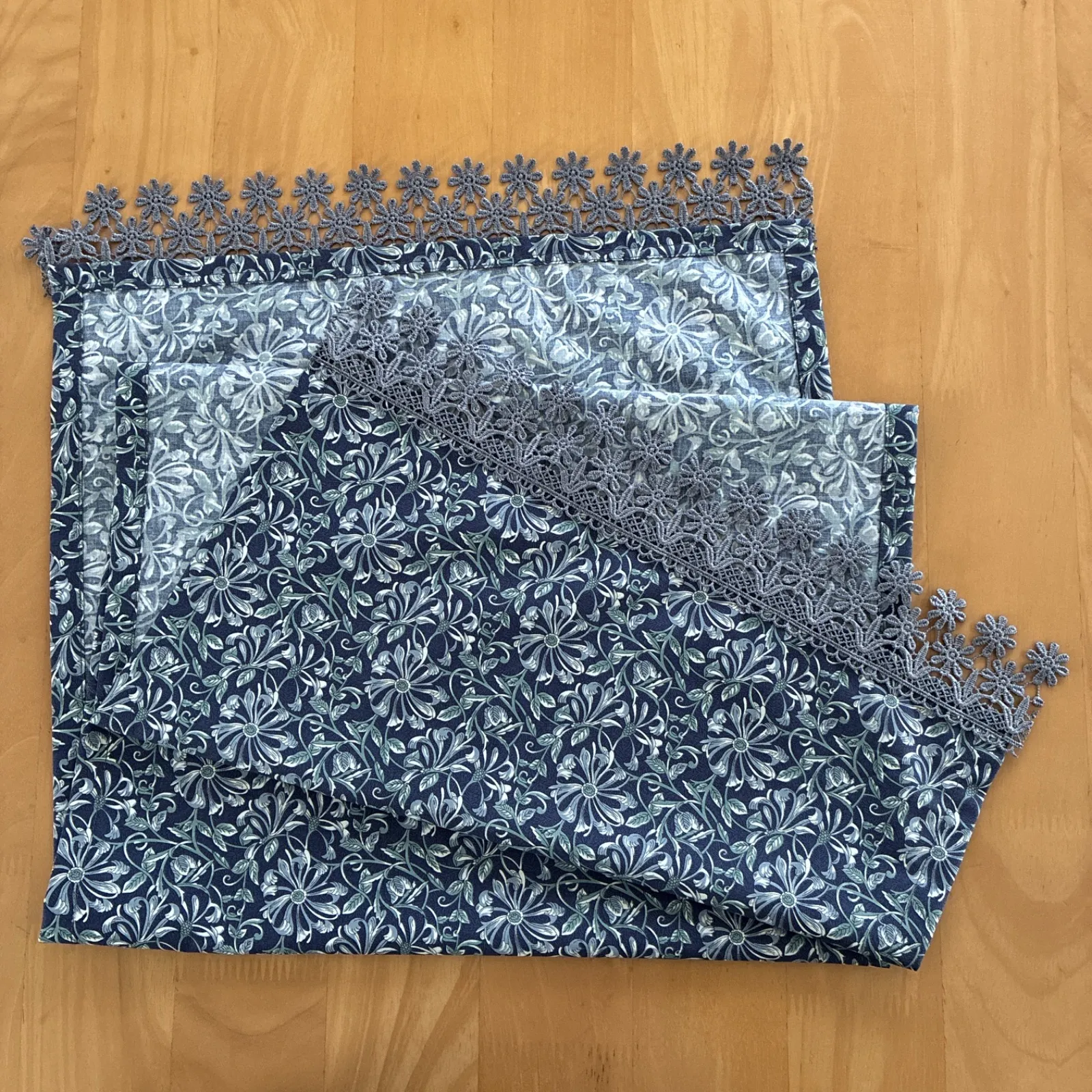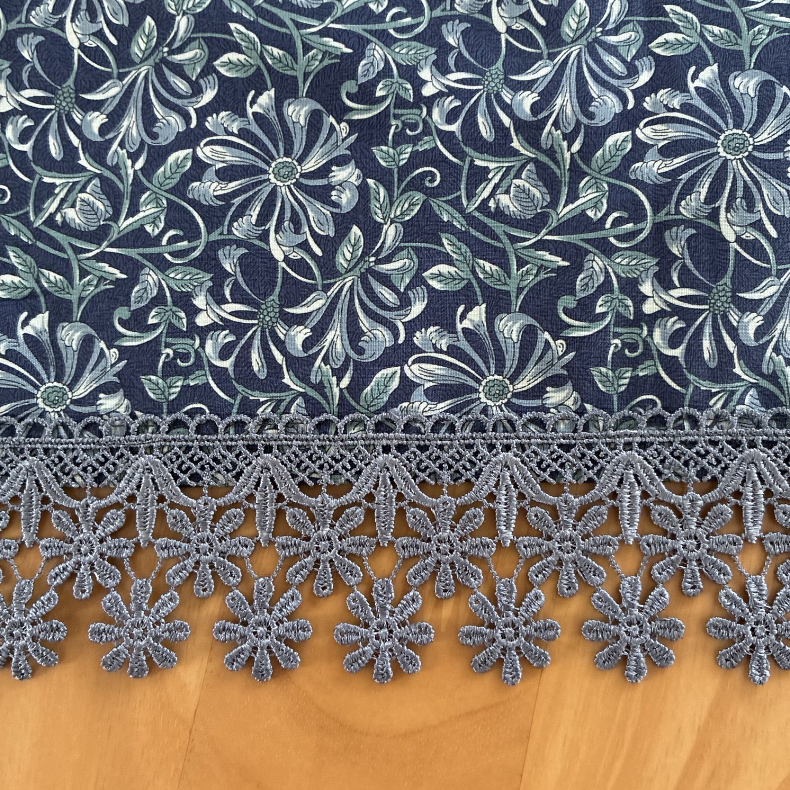 グレーのお花のモチーフレースを付けました。アンティークフラワー柄との組み合わせで「レースで縁取った静かな華やぎ」空間を演出する仕上がりになったと思います