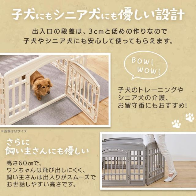 ◆子犬にもシニア犬にも優しい設計足腰・関節に負担がかからないような、低めの作りなので、子犬やシニア犬にも安心して使ってもらえます。子犬のトレーニングやシニア犬の介護、お留守番にもおすすめ!高さ60cmで、ワンちゃんは飛び出しにくく、飼い主さんは出入りがスムーズでお世話しやすい高さです。