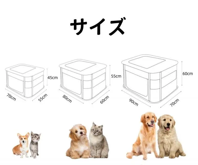 【商品仕様】サークル*1、支柱*8、キャリーバッグ*1、S:70*55*45cm(組み立て)、重さ:900g;M:80*60*55cm(組み立て)、重さ:1120g;L:90*70*80cm(組み立て)、重さ:1240g;材質:600Dオックスフォード/スチール