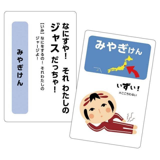 商品紹介クセになる方言が盛りだくさんの楽しいかるたです。読み上げられた方言を聞いて、それに合う都道府県を取るかるたです。全国47都道府県すべての方言カードがあります。安全警告特になし。