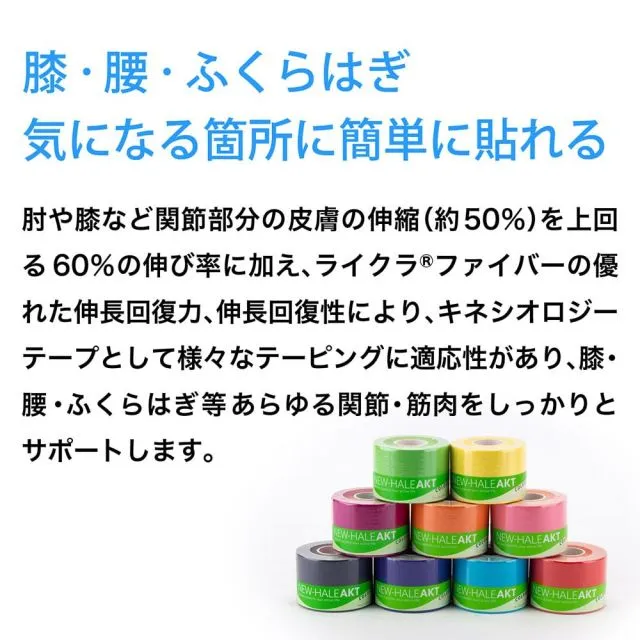 ひじ・ひざ等関節部分の皮膚の伸び率約50%を上回る約60%の伸縮率とLYCRAの優れた伸張回復性により、キネシオロジーテープ・筋肉テープとして様々なテーピングに適応性を有し、関節・筋肉をしっかりサポートします。