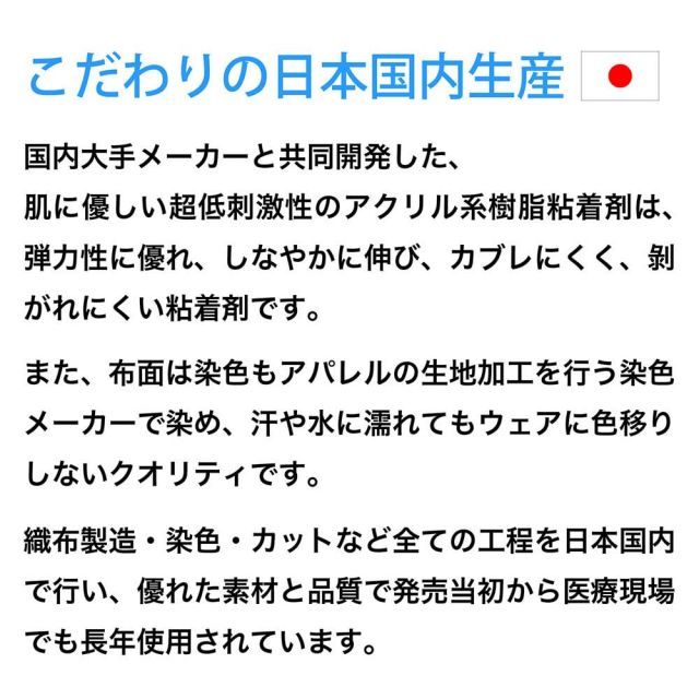 ひじ・ひざ等関節部分の皮膚の伸び率約50%を上回る約60%の伸縮率とLYCRAの優れた伸張回復性により、キネシオロジーテープ・筋肉テープとして様々なテーピングに適応性を有し、関節・筋肉をしっかりサポートします。