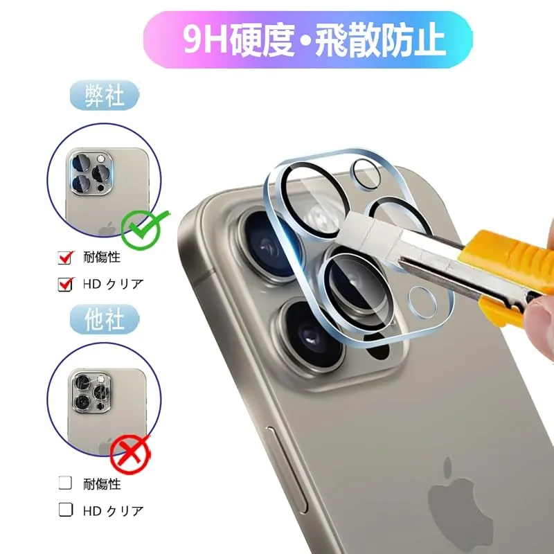 【9H硬度 飛散防止】 対応 アイフォン 15 プロ / アイフォン15プロマックス カメラフィルム はす旭硝子で作られており、スマホ保護フィルムの中で最高レベルの9H硬度に達しています。手にフィットして持ちやすく滑りにくいので落ちにくいです。万が一落ちてもフィルムが衝撃を吸収してくれるので、レンズの損傷を低限まで抑えられます。また、特殊な飛散防止設計により、ガラスが割れても飛散しないため。