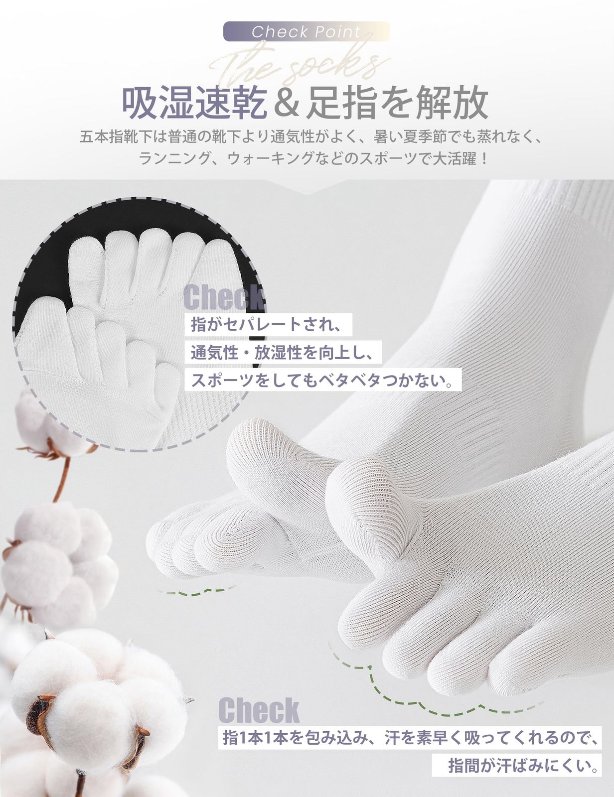 【さっと吸湿速乾・抗菌防臭】五本指ソックスは80%―90%コットン素材を採用しており、通気性抜群!足からかいた汗が冷える前に、素早く吸収・発散し、ニオイや水虫の原因となる雑菌の繁殖を抑えることができます。普通のレディース靴下だと一日中指が閉じたままで、指間が汗ばみやすい。しかし、5本指ソックスなら指がセパレートされ、通気性・放湿性に優れます。蒸れないくるぶし靴下は、ランニング、ウォーキングなどのスポーツで大活躍!