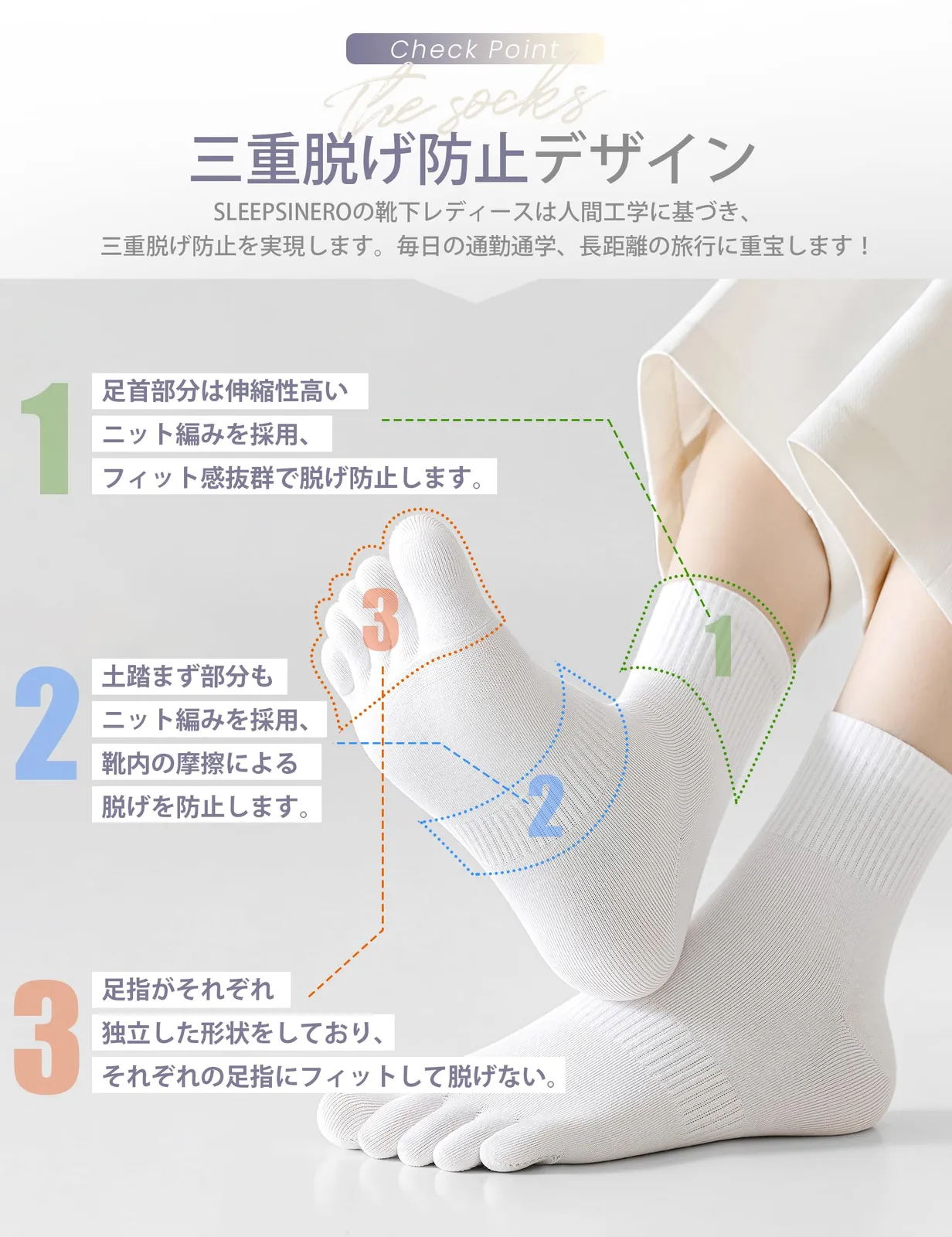 【三重脱げ防止デザイン】SLEEPSINEROの靴下レディースは人間工学に基づき、三重脱げ防止を実現します。まず、足首部分は伸縮性高いニット編みを採用、フィット感抜群で脱げ防止します。また、土踏まず部分もニット編みを採用、靴内の摩擦による脱げを防止します。さらに、足指がそれぞれ独立した形状をしており、五本指ソックスはそれぞれの足指にフィットして脱げないです。