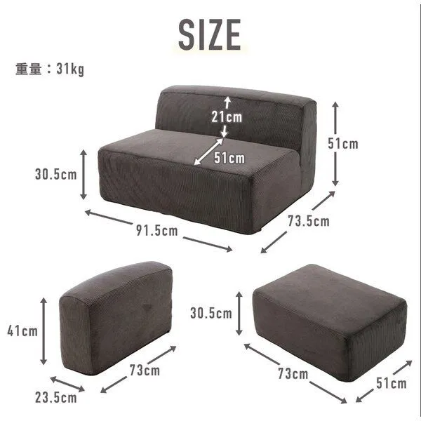 2人掛け:W91.5×D73.5×H51cm(SH30.5)1オットマン:W51×D73×H30.5cm肘:W23.5×D73×H41cm製品重量:31kg/set
