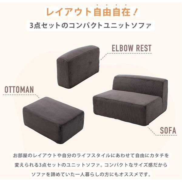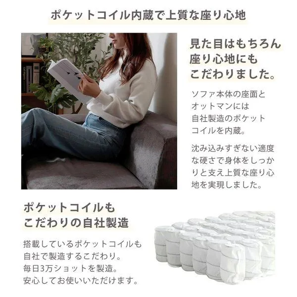組み合わせを自由に変えられるユニットソファ。本体・オットマンは座面にポケットコイルスプリングが入っているのでクッション性抜群です。もこもことした心地よい肌さわりのブークレ生地を使用