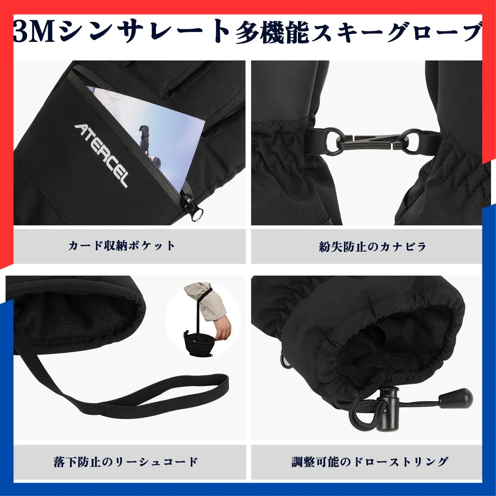 【心地よいデザイン】①カード、小物収納用ポケット。②紛失防止のカナビラ。③落下防止のリーシュコード。④落下防止のリーシュコード。⑤調整可能のドローストリング。⑥袖口弾力ゴム。⑦手のひらに滑り止め素材。⑧3D立体裁断シルエット。ATERCEL冬用手袋は防寒、防風、保温、通気とすべてを兼ね備えたスキー手袋で、冬場に大活躍しています。