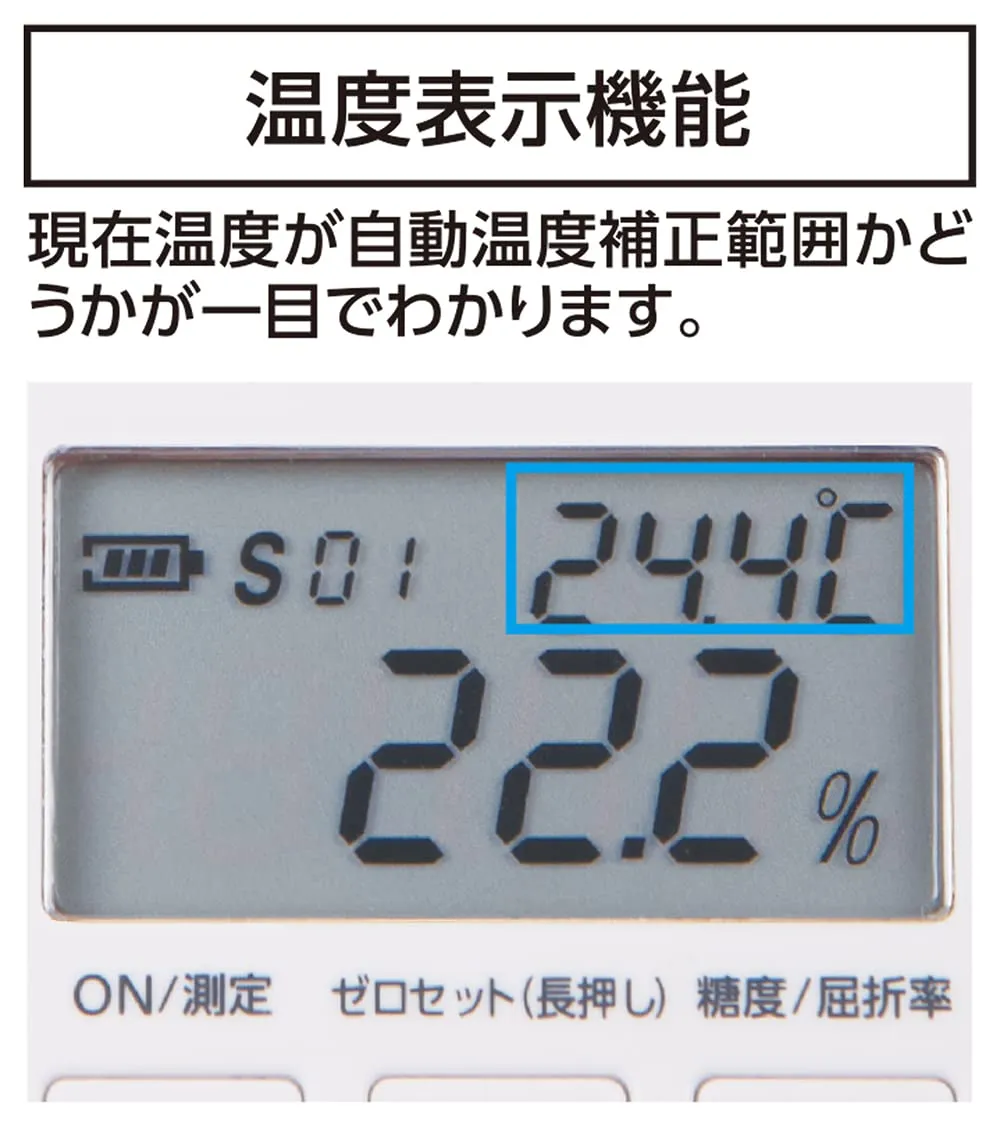 大きな液晶表示で読み取りやすいデジタル式の糖度計です。現在温度が表示されますので、自動補正範囲かどうか一目で確認できます。(補正範囲5~40℃)