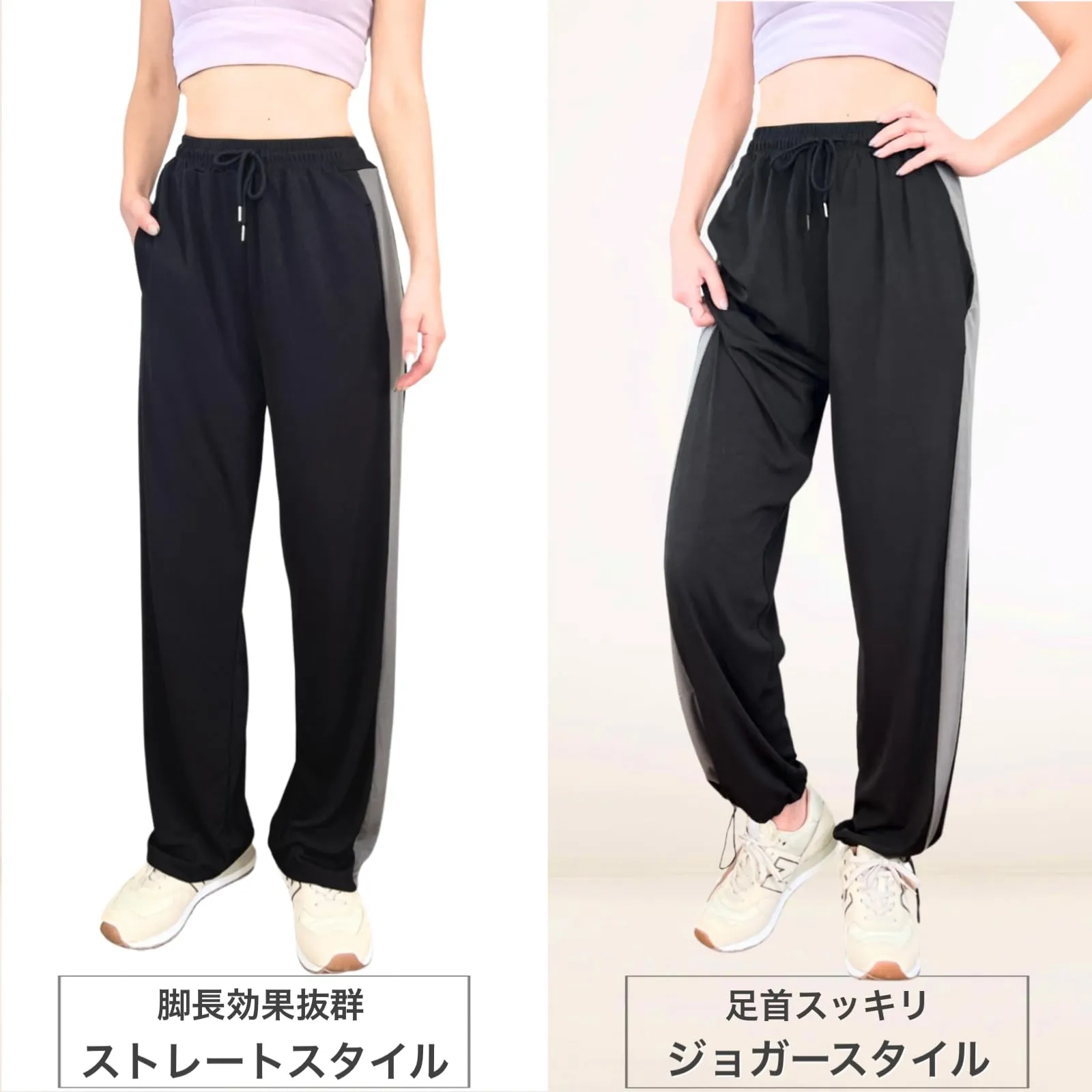 【足くびにはドローコード付き】ストレートなシルエットと足首を絞ったシルエットが使い分けられる2WAY仕様。動きやすくお洒落なデザインで、運動時/リラックス時などスタイルを変えて着用できます。