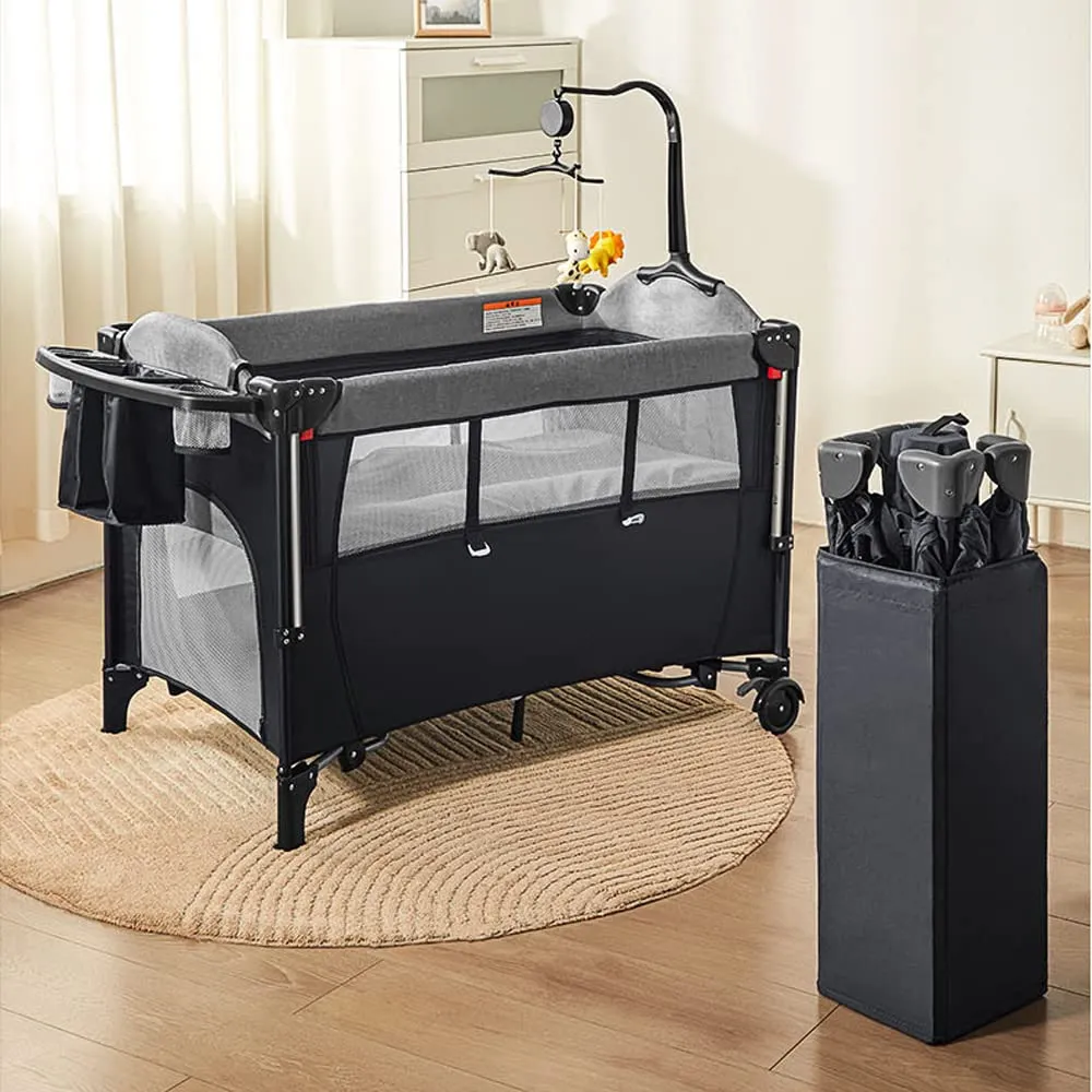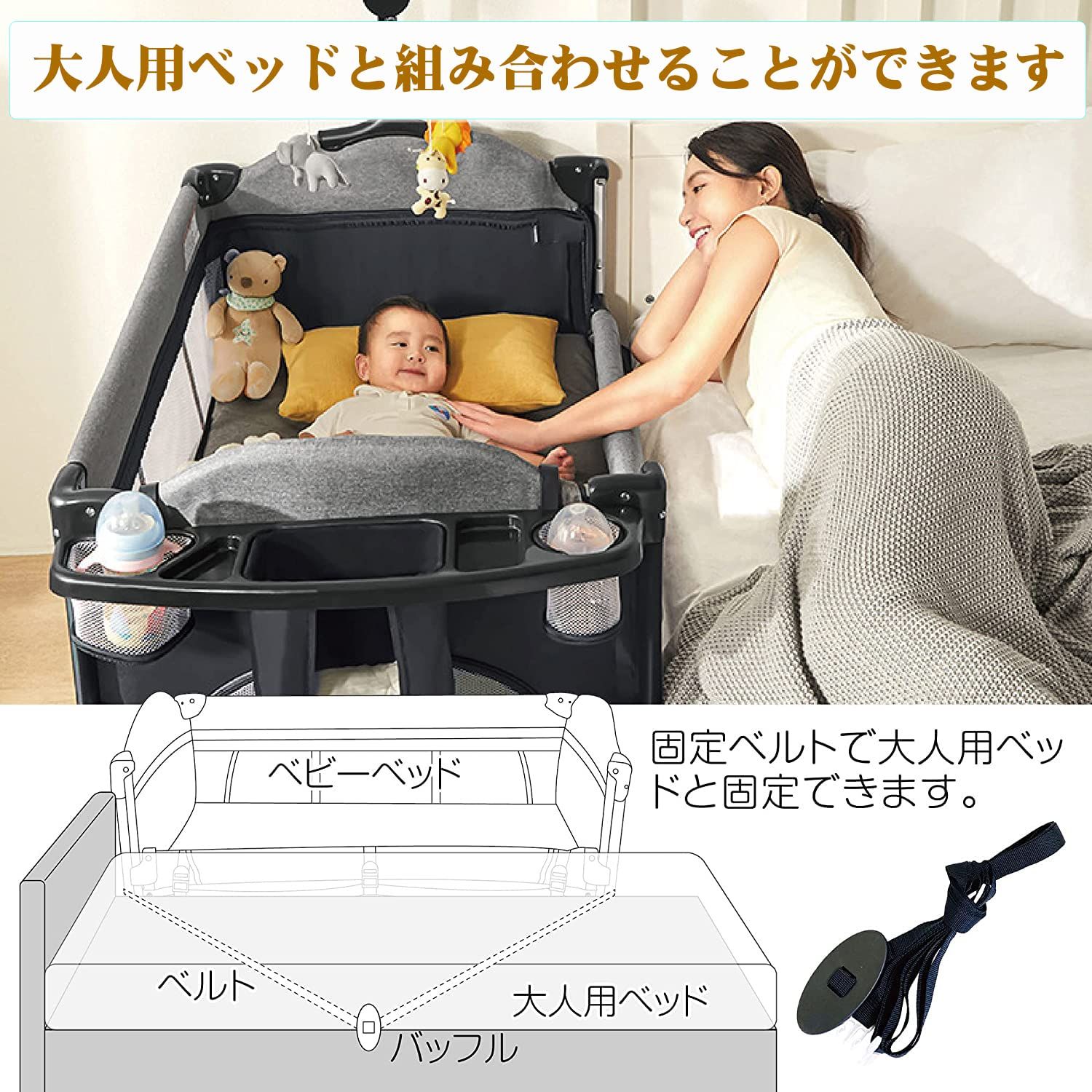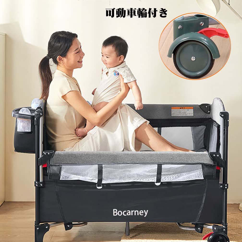 多機能セット内容:1ベビーベッド本体 2便利なおむつ交換台、ベッドから取り外し可能です 3おむつ、哺乳瓶などのようなもの置き台 4オルゴールとおもちゃラック 5横揺れモード 6大人のベッドと固定用ベルト 7静音キャスター付き、自由に移動 8マット9収納袋