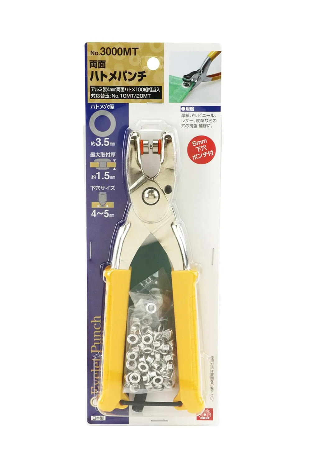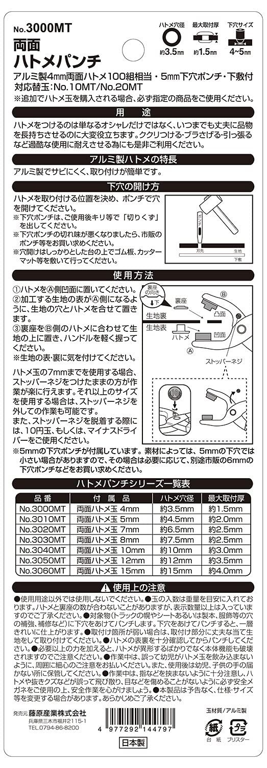 【特徴】・ハトメを取り付けるのは、単なるおしゃれにとどまらず、穴の補強をすることで、品物を長持ちさせるのに役立つ・アルミ製・真鍮製の4mmのハトメ玉が使用できる