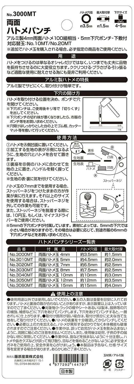 【注意事項】※使用用途以外では使用しないでください。※ハトメ玉の入数は重量を目安に入れております。※数量が表示と合わない場合もありますが、表示数量よりは多く入っております。※あらかじめご了承ください。※取り付ける材料には、下穴をあけてからご使用ください。※取り付け箇所が弱い場合には、丈夫な当て生地を取り付けるなどしてからご使用ください。※ご使用の際には、ハトメの表裏・取り付ける材料の表裏などにご注意下さい。※特に、ハトメ玉の表裏を間違えると、うまくかしめられることが出来ず、ハトメパンチ本体・玉・材料などにキズをつける場合もあります。※取り付ける材料の材質によって、取り付け厚が変わることがあります。※あらかじめご了承ください。※その他、注意事項につきましては、パッケージ裏などに記載の内容をよくご確認頂きまして、ご使用ください。※また、パッケージは保管し、ご使用時に確認が取れるようにしてください。