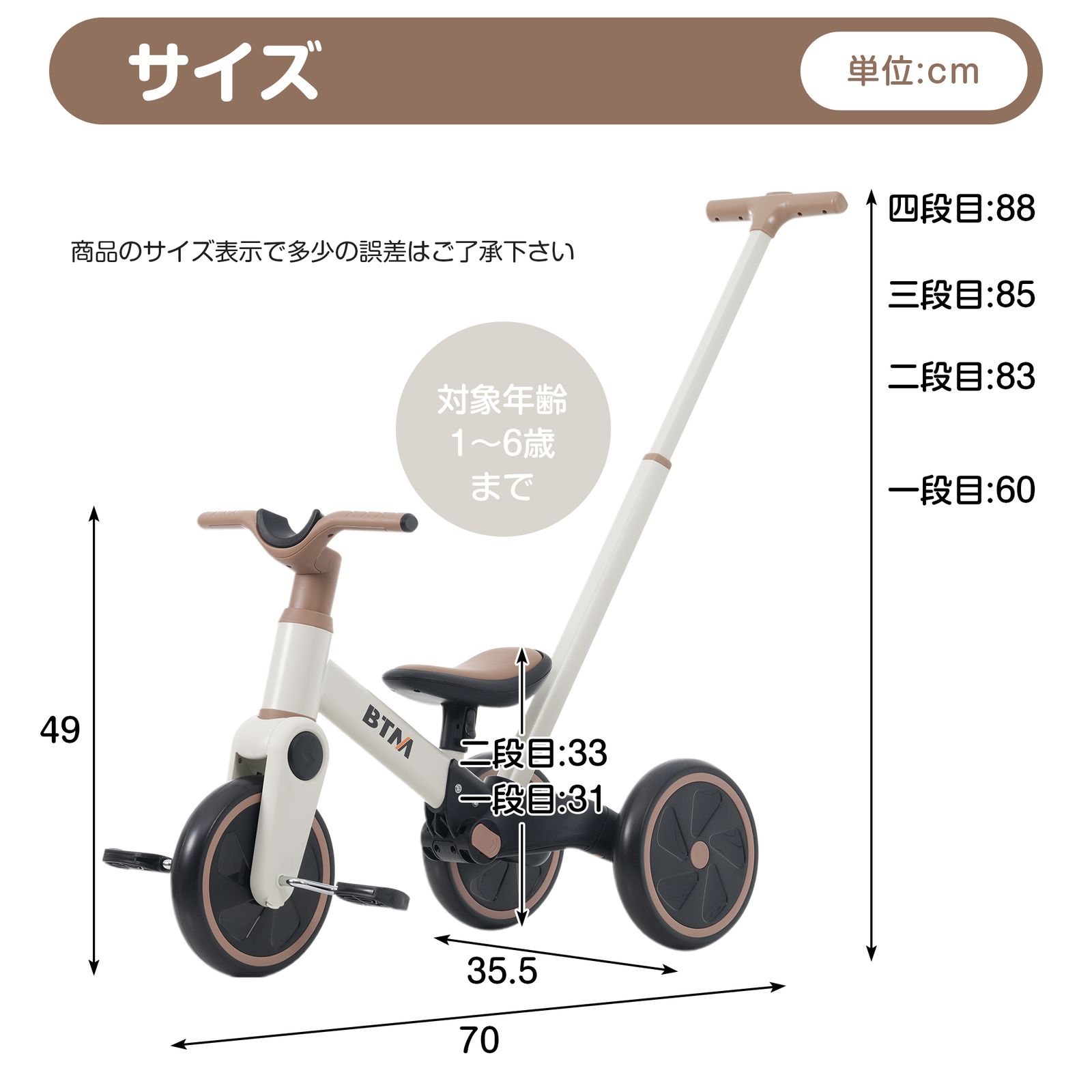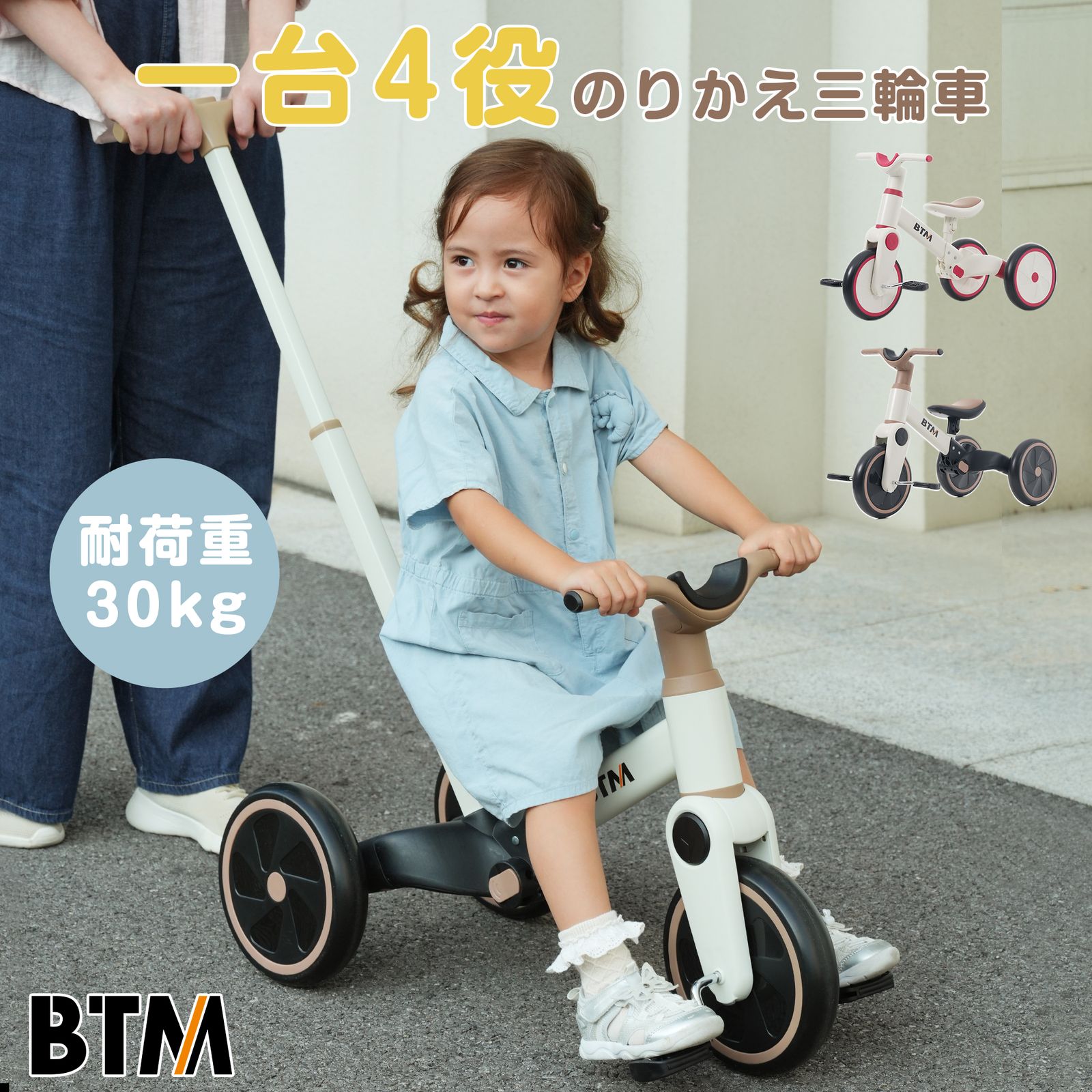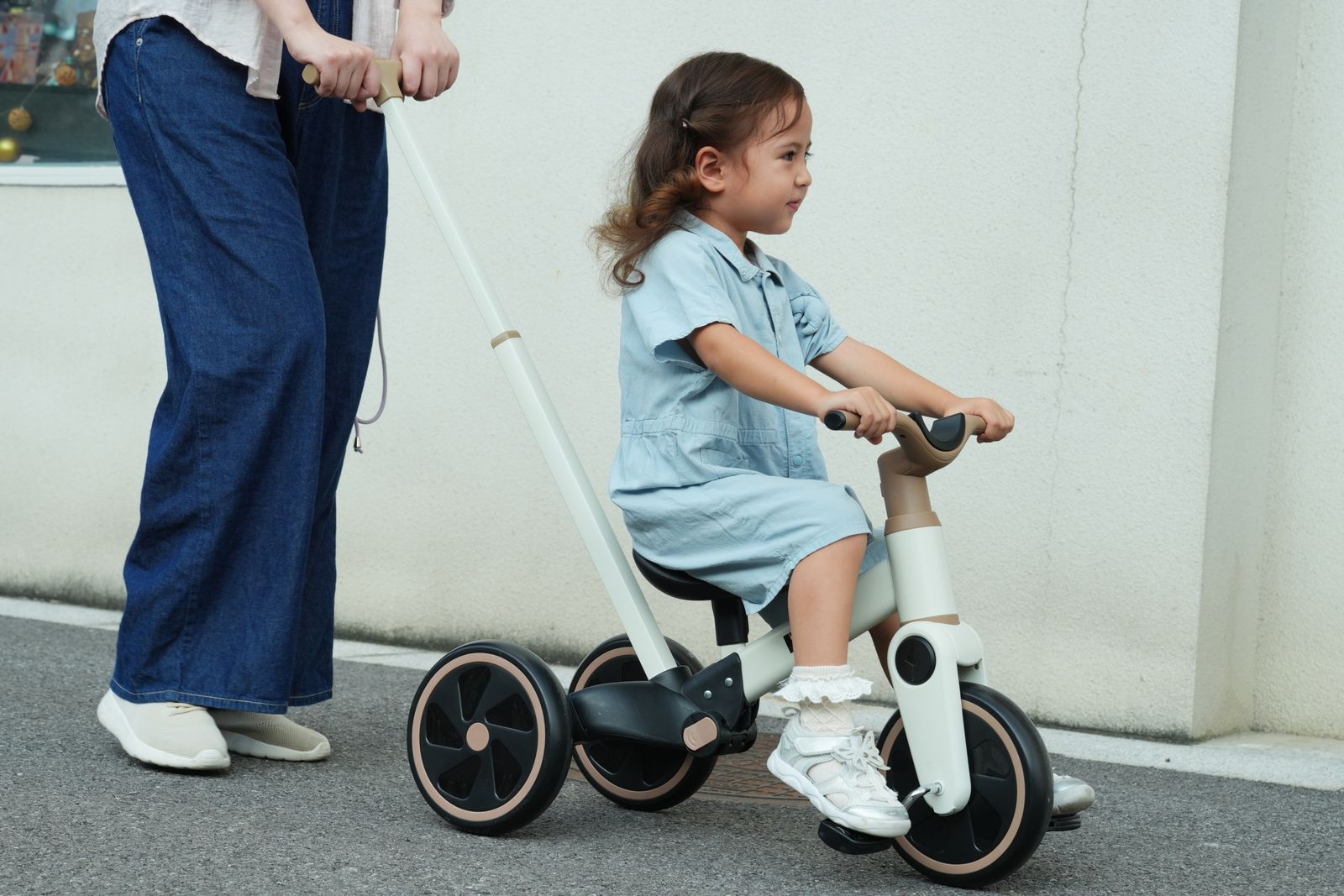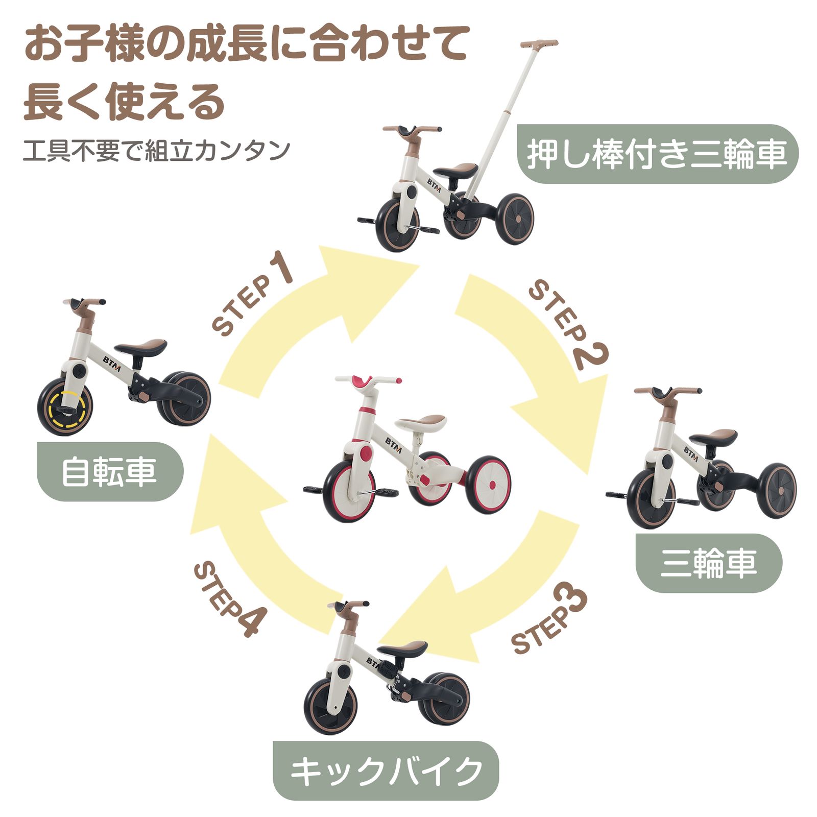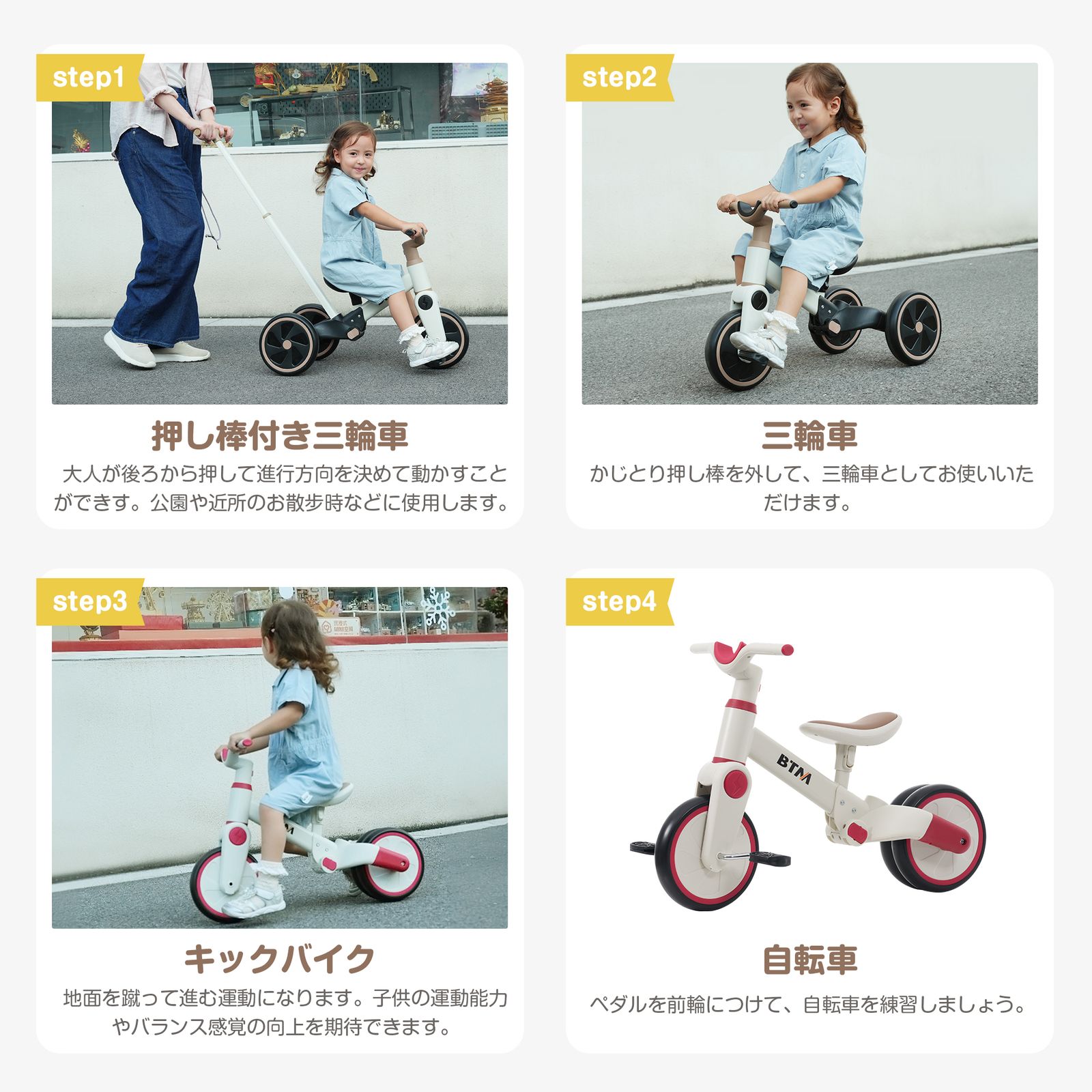 【一台4役】手押し三輪車モード、三輪車モード、ランニングバイクモード、自転車モード。様々な使い方があり、工具なしで組み合わせできです。お子様の成長に合わせて4階段でご使用いただけます。