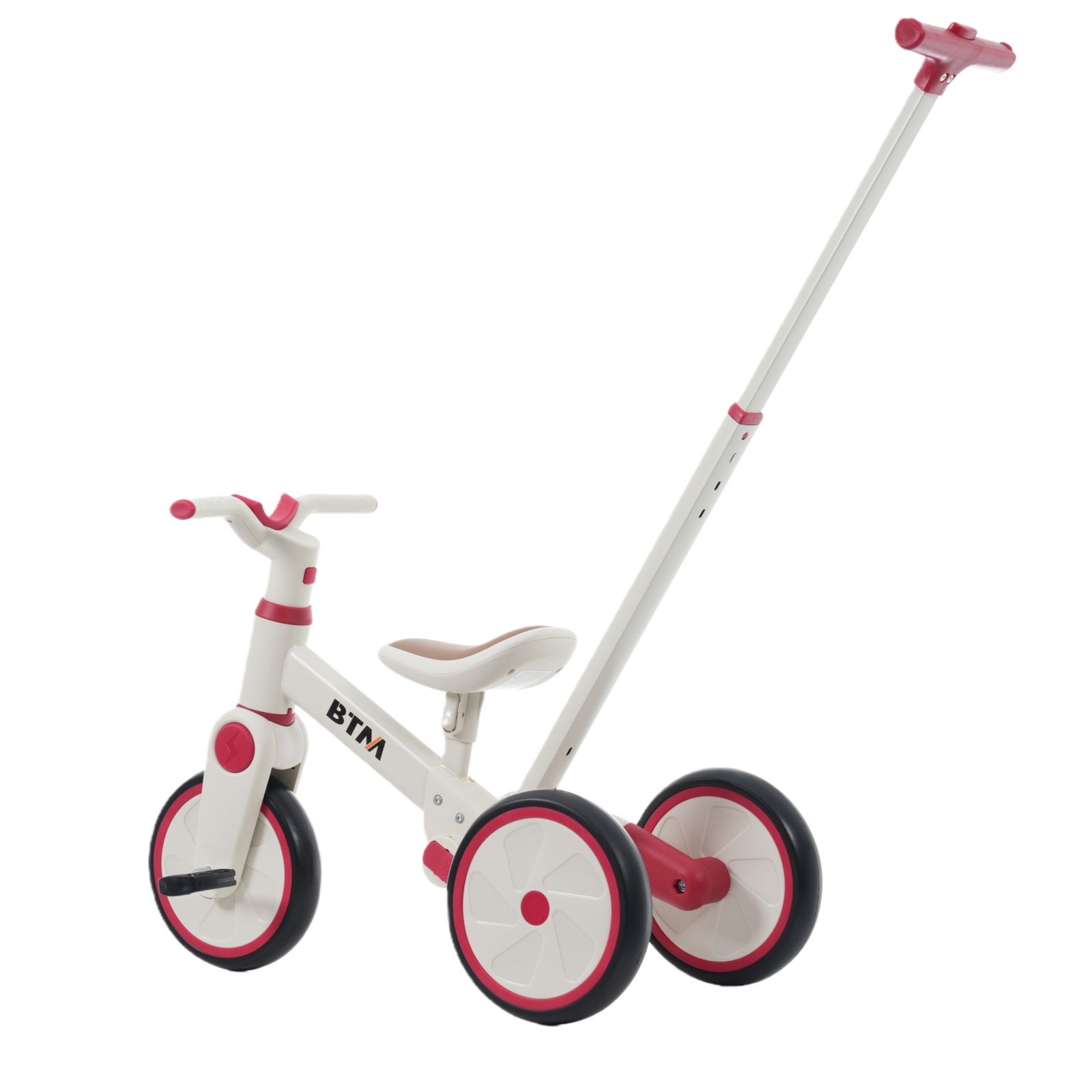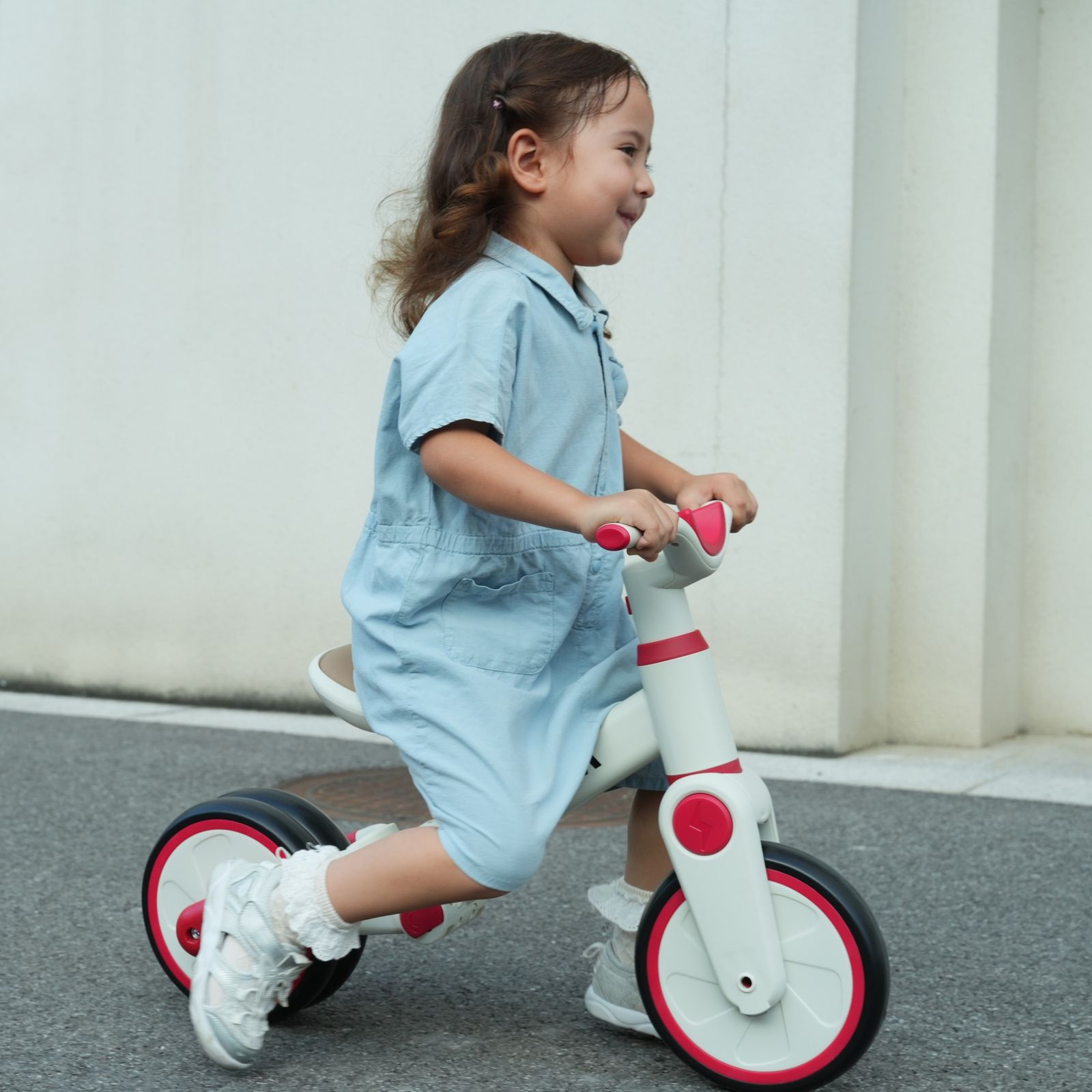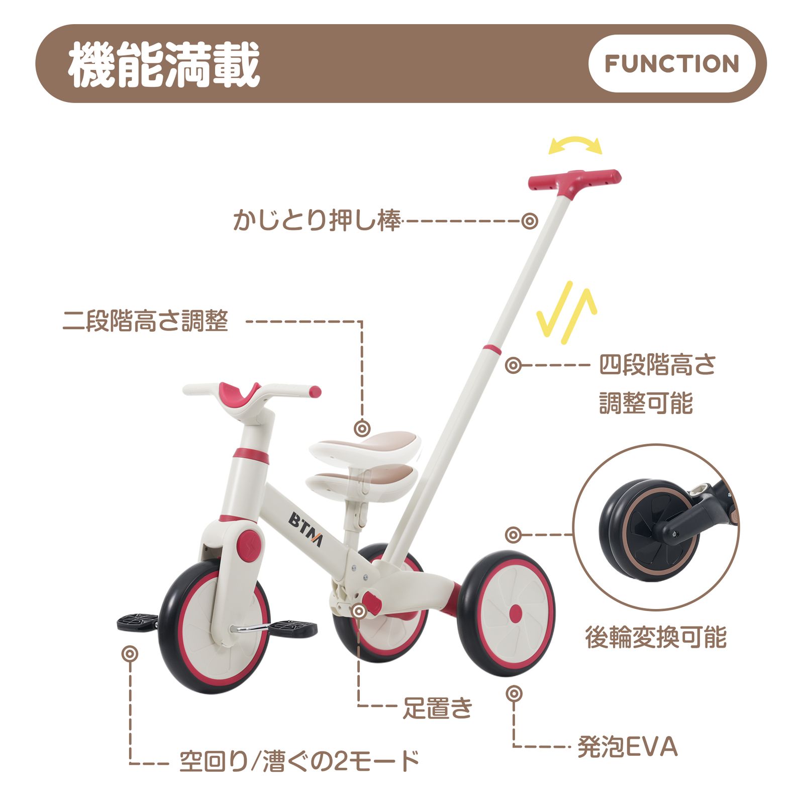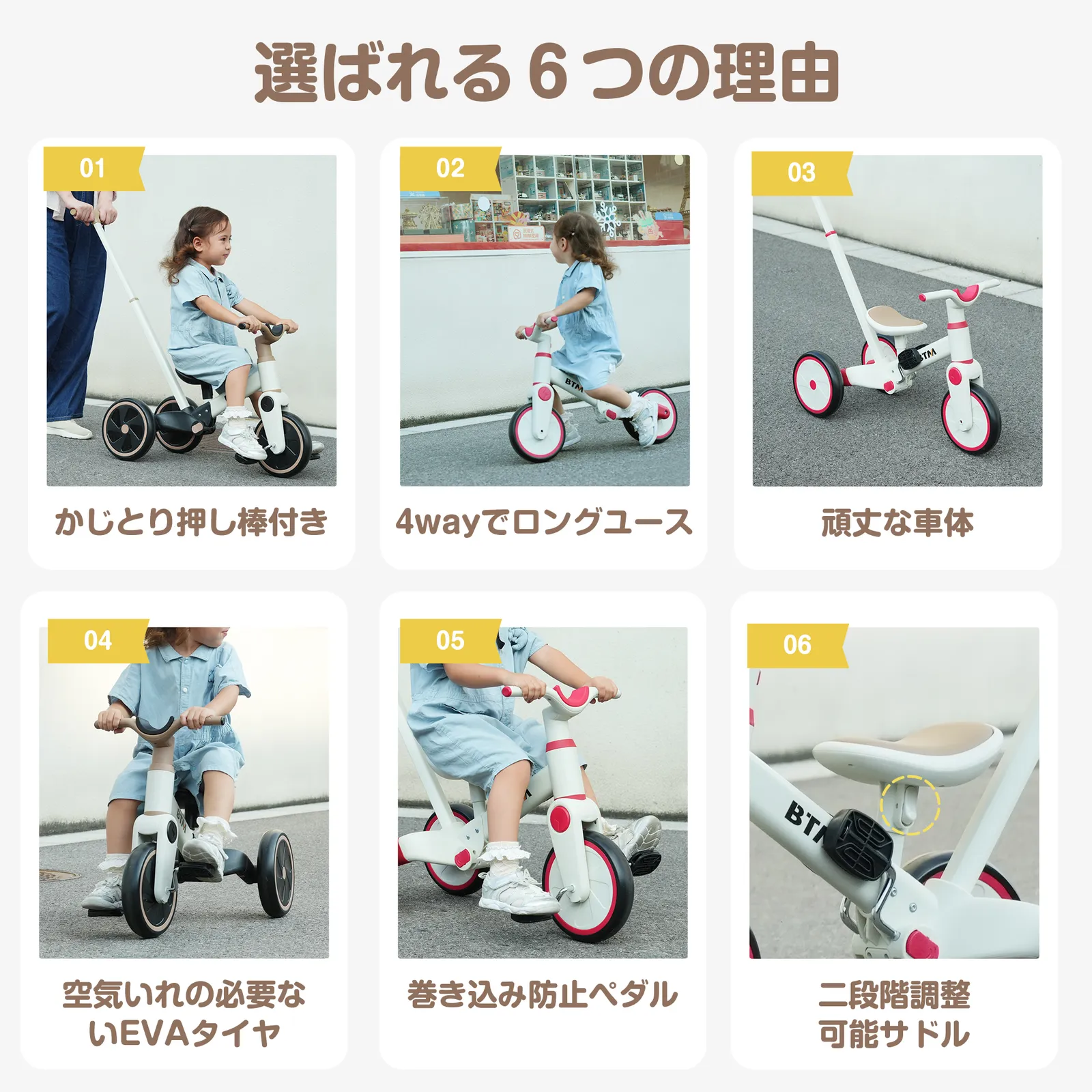 【一台4役】手押し三輪車モード、三輪車モード、ランニングバイクモード、自転車モード。様々な使い方があり、工具なしで組み合わせできです。お子様の成長に合わせて4階段でご使用いただけます。
