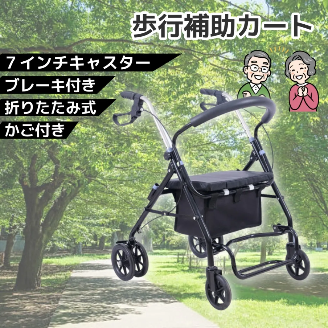 歩行補助カー シルバーカー ショッピングカート 歩行補助 介護 カート お買い物カート 4輪 6輪 後輪ダブル 後輪4輪 7インチ キャスター ブレーキ付き ハンドブレーキ 折りたたみ 高さ調整 4段階 座れる 座面付き 背もたれ付き PUクッション 取り外し かご付き バスケット付き 収納 大容量 軽量 コンパクト 外出 散歩 通院 高齢者 母の日 敬老の日