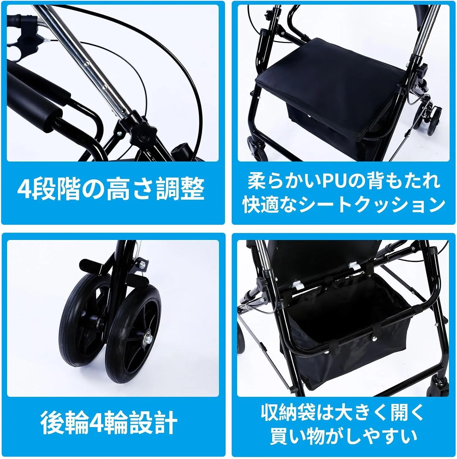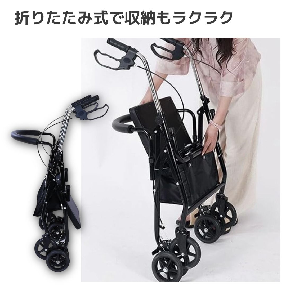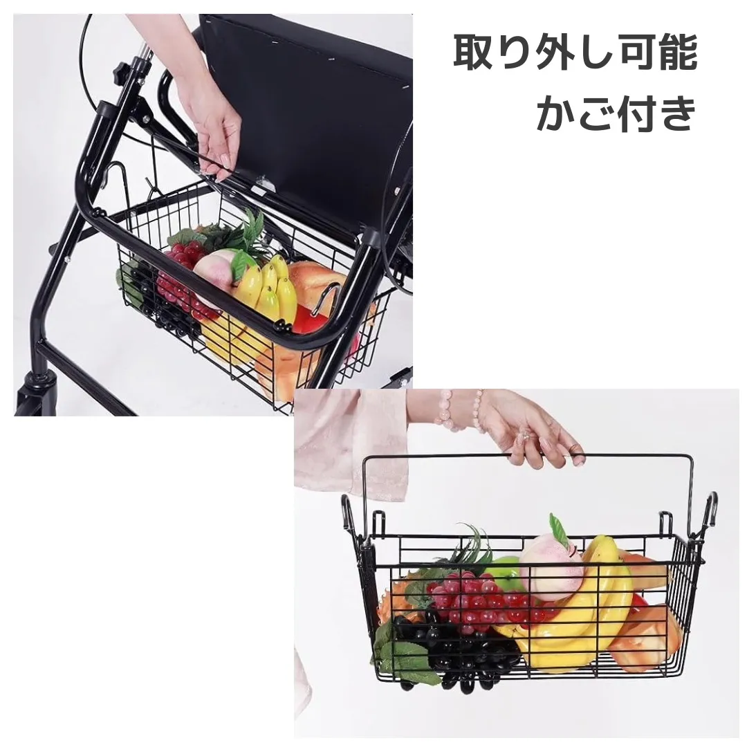 歩行補助カー ショッピングカート ブレーキ付き 折りたたみ 取り外し可能かご 後輪4輪設計 黒 ブラック