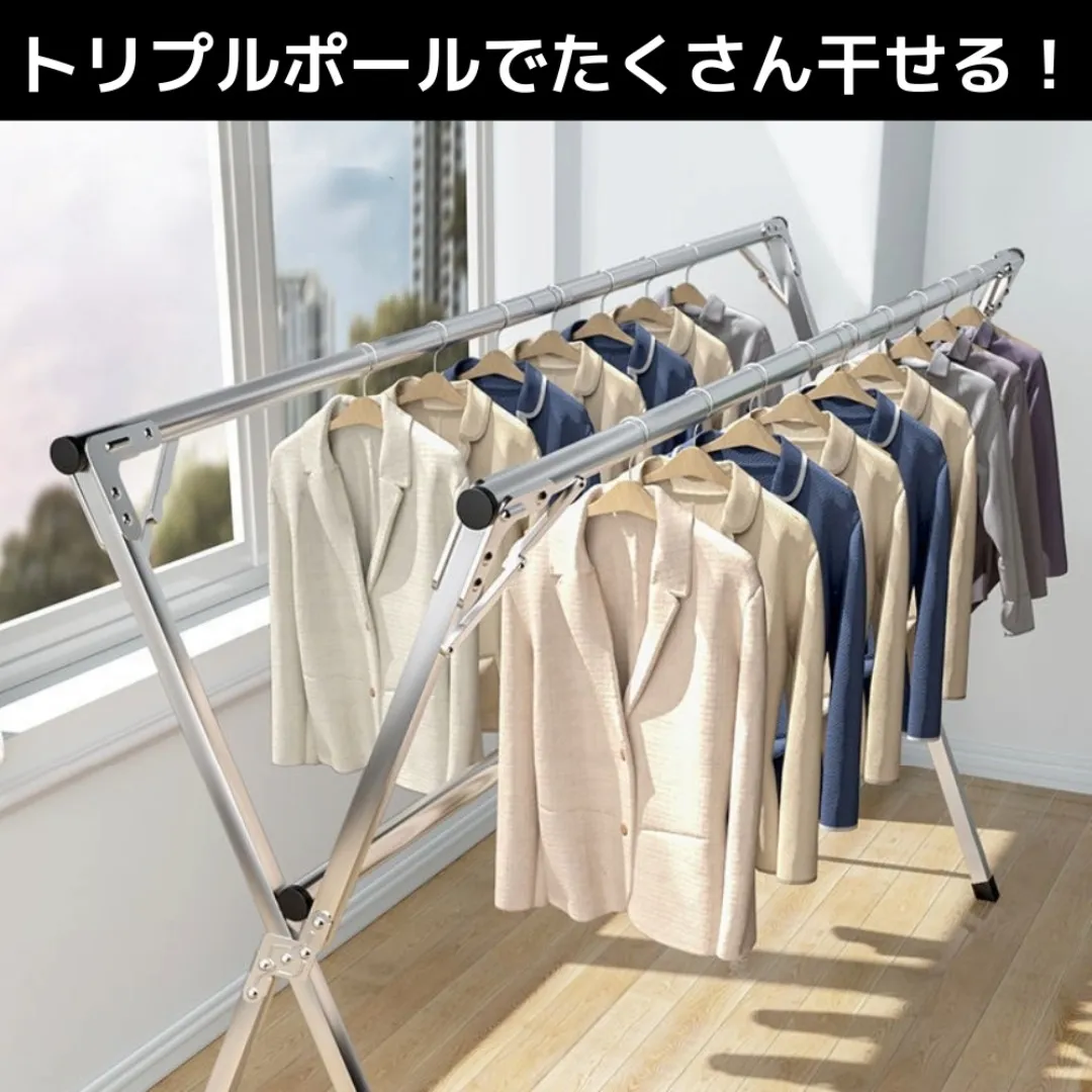 高さ125cmで丈の長い衣類も干しやすく、トリプルポール仕様だからシャツ・アウター・タオル類までまとめて干せます。使わない時は折りたたんでスリムに収納でき、室内干し・ベランダ干しどちらにもおすすめです。