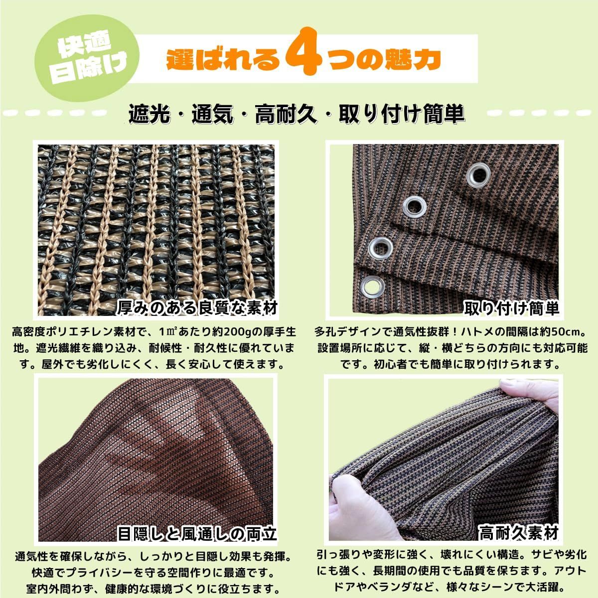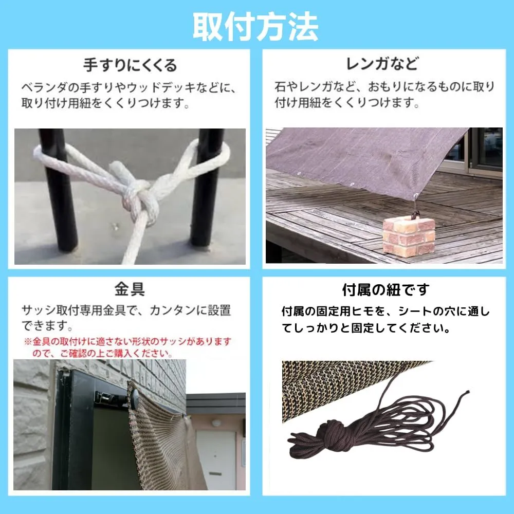 【簡単な取り付け】多孔質の目のデザインで、四辺に十分な数のハトメ穴があります。強い生地で遮蔽性も優れており、白い紐が付属しています。取り付けは簡単で、汚れても水洗いできるため、手入れが簡便です。自然な形状記憶加工により、折りたたみ時のシワも自然に戻ります。シーズンオフにはコンパクトに折りたたんで収納できます。
