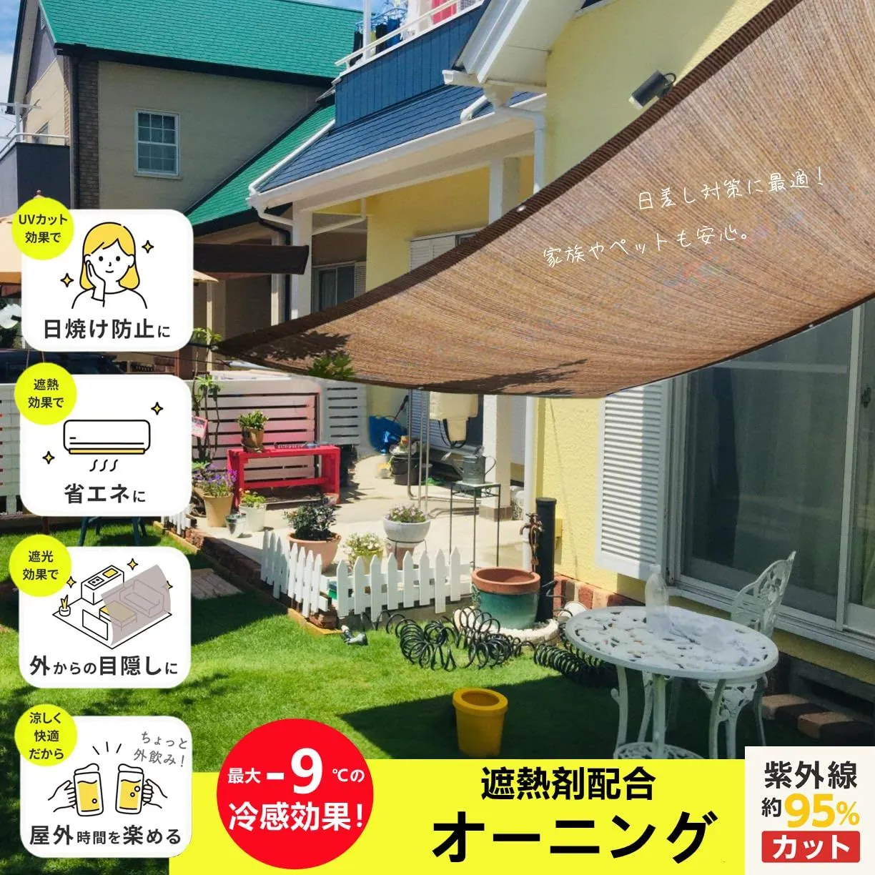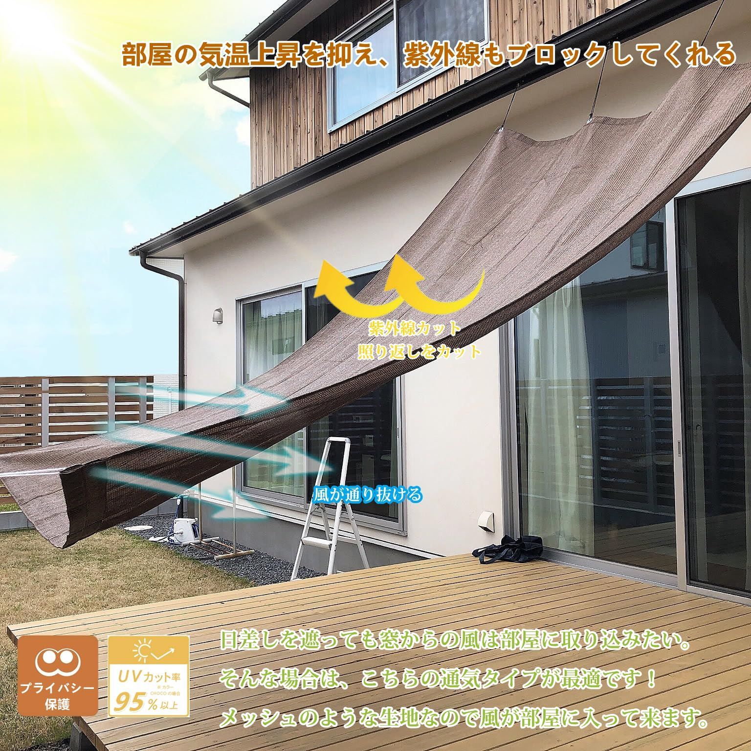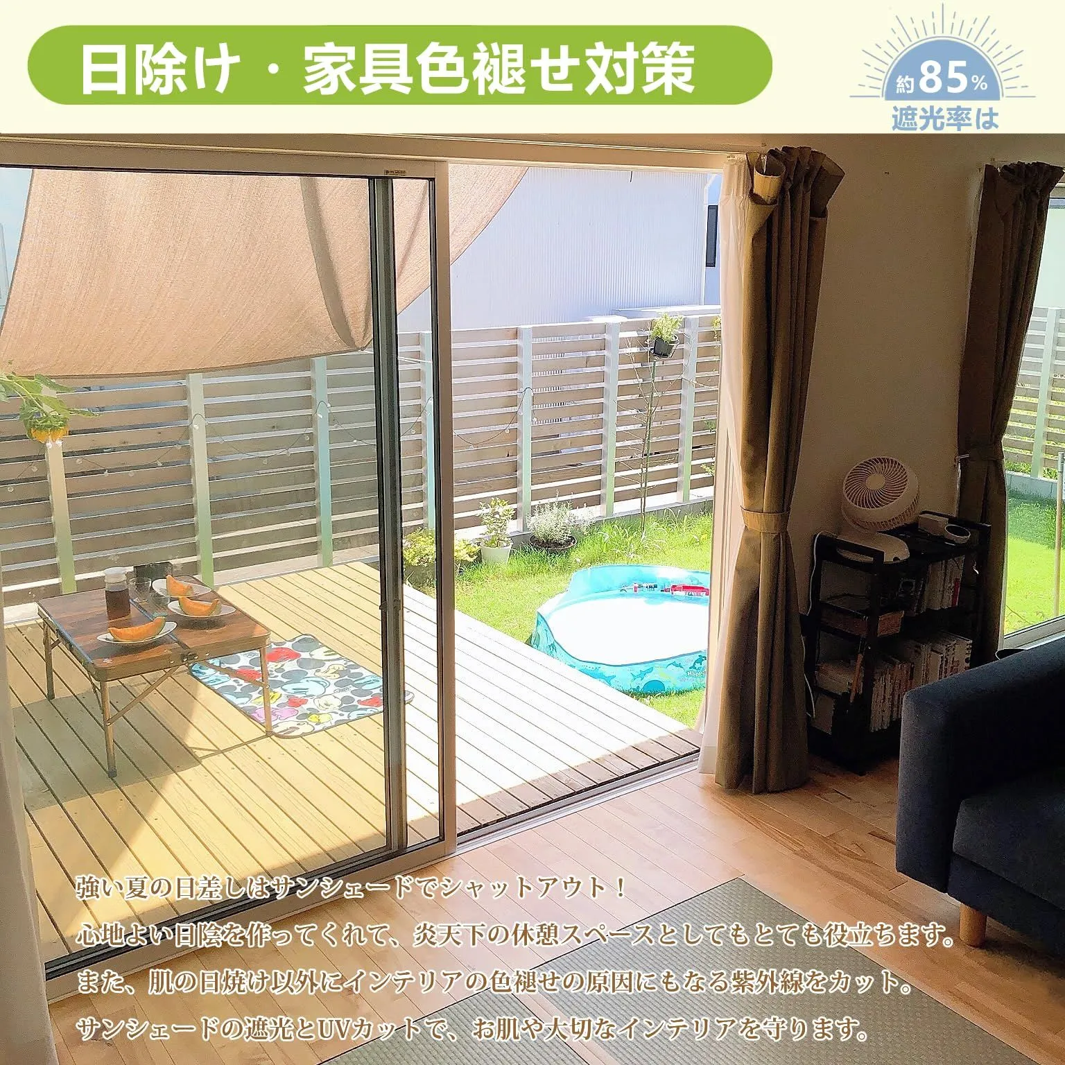 【遮熱効果(45%カット)・日よけシート】高い遮熱効果を持つ生地を使用しており、太陽からの熱や地面からの反射熱を45%カットする日よけシートです。室内の温度が下がり、まるで木陰のような涼やかで快適な空間を演出します。