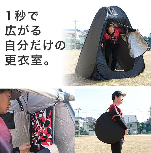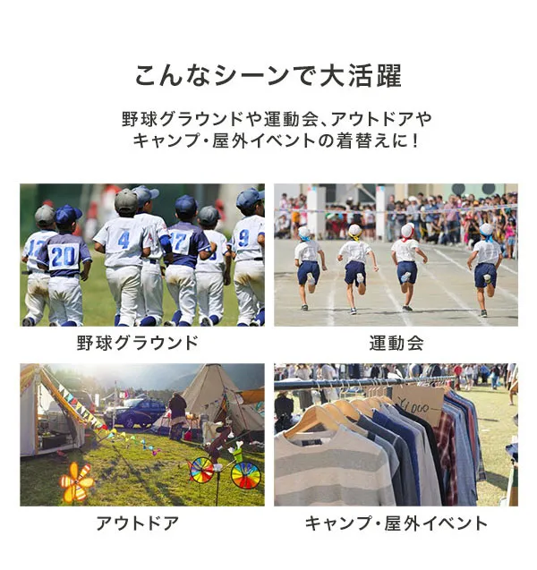 野球のグラウンドや運動会、アウトドアやキャンプ、海水浴、屋外イベントなど、「着替える場所がない」「人目が気になる」、そんなシーンで活躍する着替え用テントです。