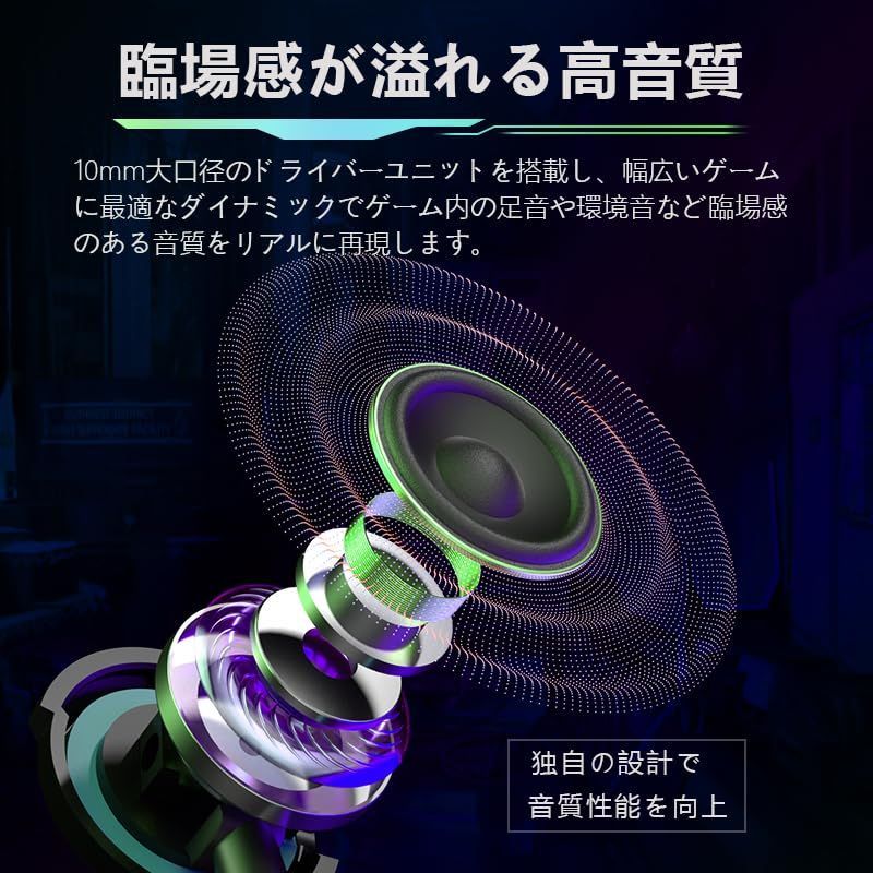【高音質サラウンドサウンド】大型10mm ダイナミックドライバーと最適化された内部防音キャビティにより実現した迫力のサラウンド効果により、透明感のあるクリアな高音と力強く豊かな重低音を再現。あらゆる動画、音楽、ゲームの体験を深める臨場感、ゲーム内の環境音や音の方向、モンスターの足音や敵の銃声などをクリアに聞くことができます。