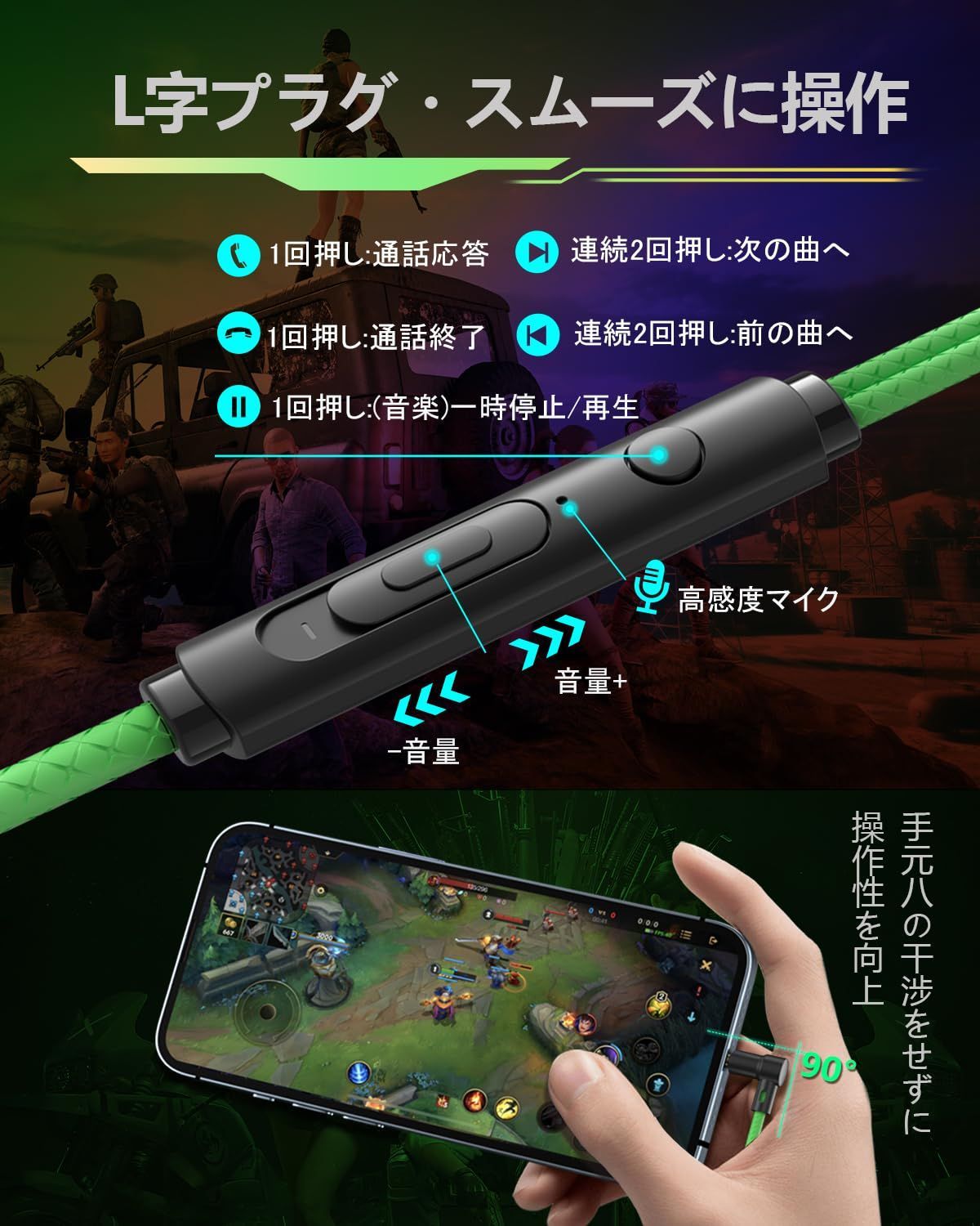 【人間工学デザイン&L型プラグ】有線ゲームイヤフォンは人間工学に基づき45°傾斜型デザインにより、耳にしっかりフィットするので外れにくいです。柔軟な素材ですので長時間つけることによる耳や頭の痛みを軽減し快適にご使用になれます。イヤホンは密閉型で音による体感を高めることができます。また、ゲーミングヘッドセット特有の重さや暑さを取り除くことができます。スマホでゲームする際も、L型プラグで手の動きを妨げることはありません。ゲームをより快適に楽しむ事ができます。 デュアルマイク構造:装着式マイク&インラインマイク(合計2基)を備えています。この設計により、取り外せるマイクを装着すると自分の最適な位置まで曲げますので、実況、英会話、ボイスチャット、スマホゲーム(荒野行動やPUBGモバイルなど)、PS4・プレステ4(モンハン、fpsなど)、ニンテンドースイッチ(スプラトゥーンなど)のゲーム中、より快適にVC・ボイチャができます。リモコン内蔵インラインマイクより、普段でも手軽く普通の携帯通話やLINEチャットも可能です。