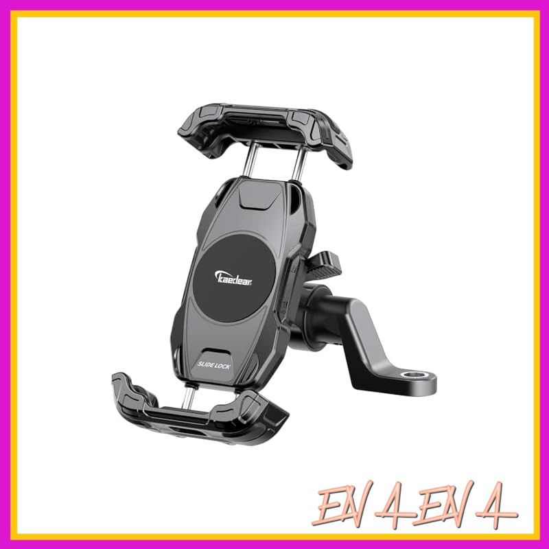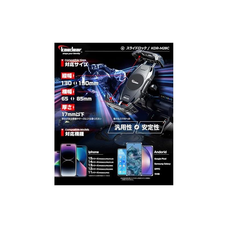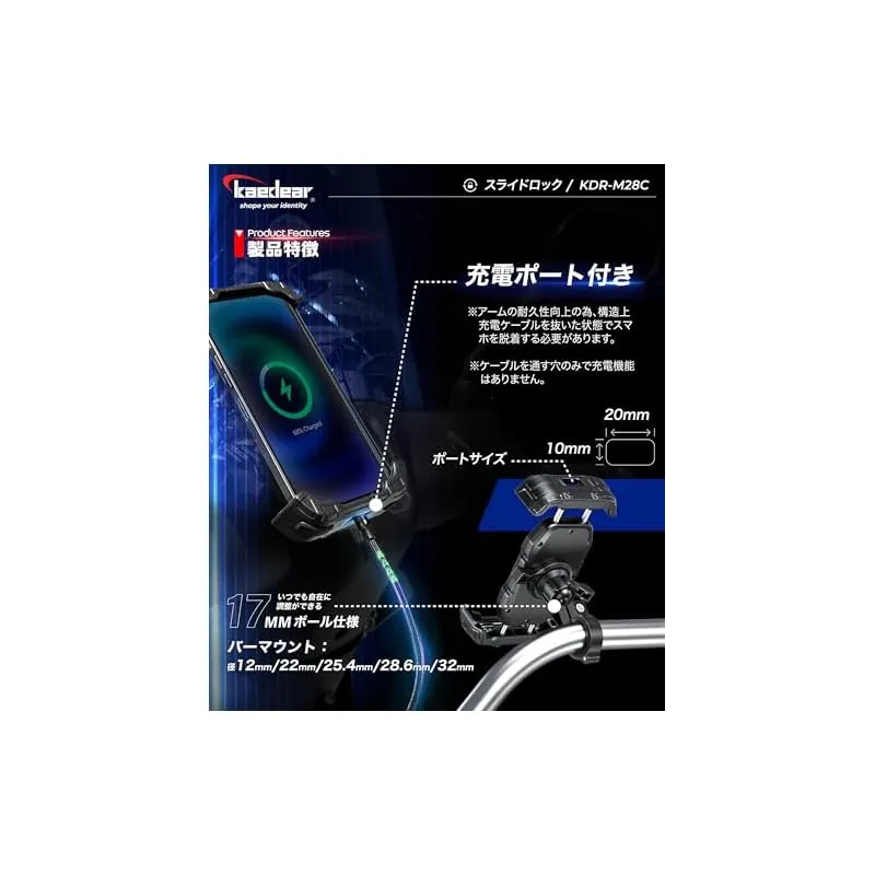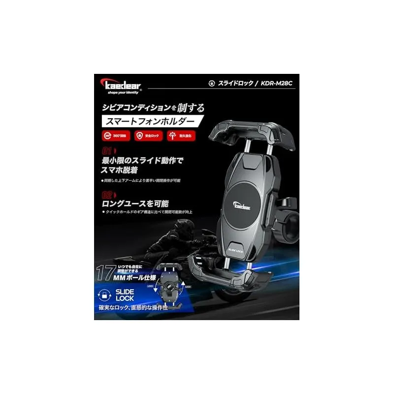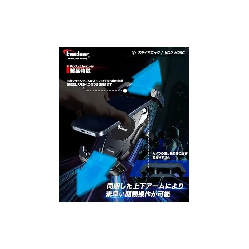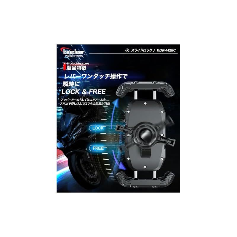 【スライドロック】 アッパーアームとロアアームを金属ギアで同期させる事で最小限のスライド動作でスマホを脱着できるスマホホルダー。業務用途でのバイク需要が拡大する中、シビアコンディションに対してロングユースを可能にしながらスマホ脱着性も維持したモデル。アッパーアームもしくはロアアームをスマホで押し込んでスマホの脱着が可能です。走行中の衝撃でアームが開かないようにサイドレバーでアームの固定ができます。17mmボールマウントで自転車などのバイク用途以外でも使用しやすい構造。別売りの振動吸収防振ダンパーAirアブソーバーに対応。 「耐久性が高い構造が良いけどスマホ脱着性も確保したい」「すっきりした17mmボールマウントが良い」「四角に返しがあるアームの方が安心感がある」、そんな方にオススメなモデルKDR-M28Cです。