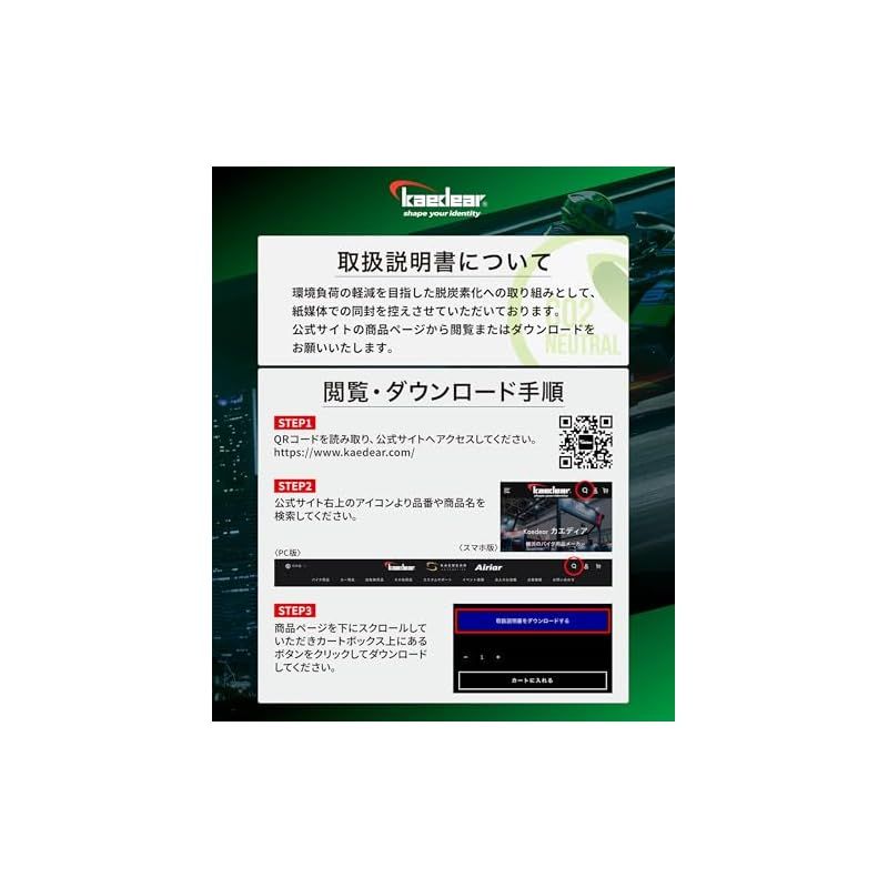 ■取扱説明書(オンラインのみ):環境負荷の軽減を目指した脱炭素化への取り組みとして、紙媒体での同封を控えさせていただいております。Kaedear公式サイトの各商品ページから閲覧またはダウンロードが可能です。