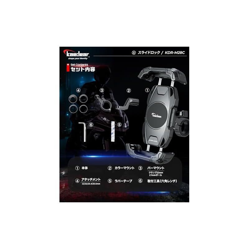 ■セット内容:本体(17mmボール)、バーマウント(17mmボール/32mm/幅15mm)、ミラーマウント(クランプ22mm/M10/厚7mm)、径変換アタッチメント(12/22/25.4/28.6mm)、2mmラバーテープ、六角レンチ、