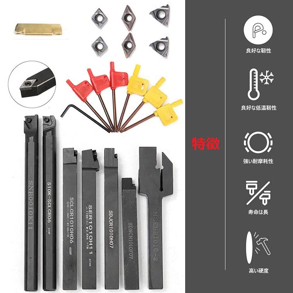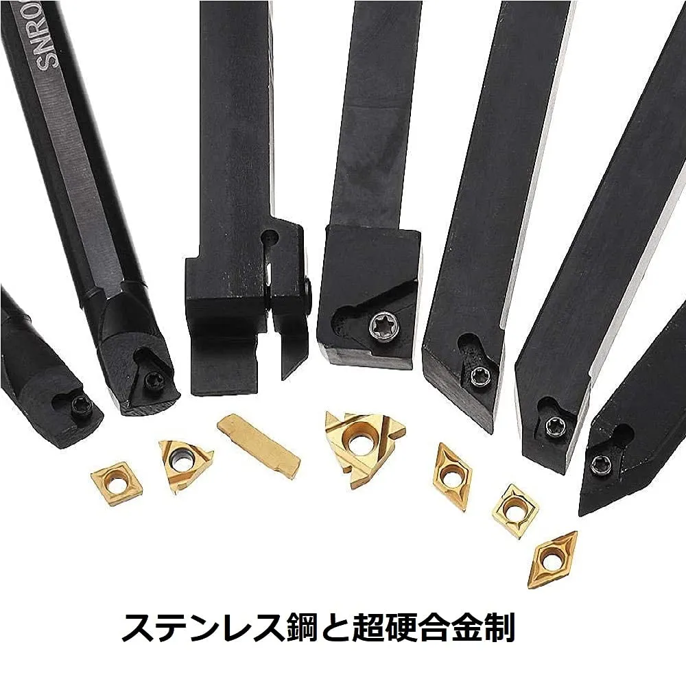 【材質】こちらの商品はステンレス鋼と超硬合金で作られた旋盤バイトです。優れた高硬度と良好な靭性が備えています。真っ直ぐで均一な超硬刃は鋭くて優れた切削面構造により、加工速度を上げることができます。注意:バイトチップが付属していません。
