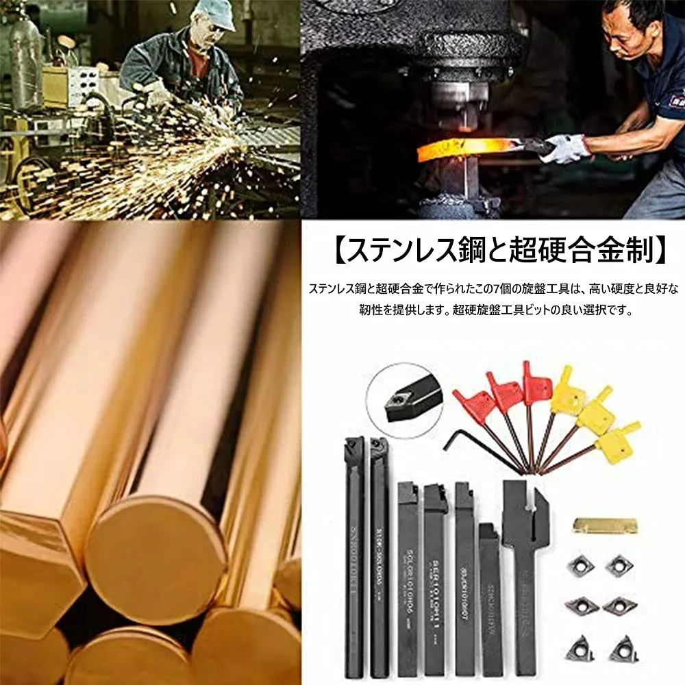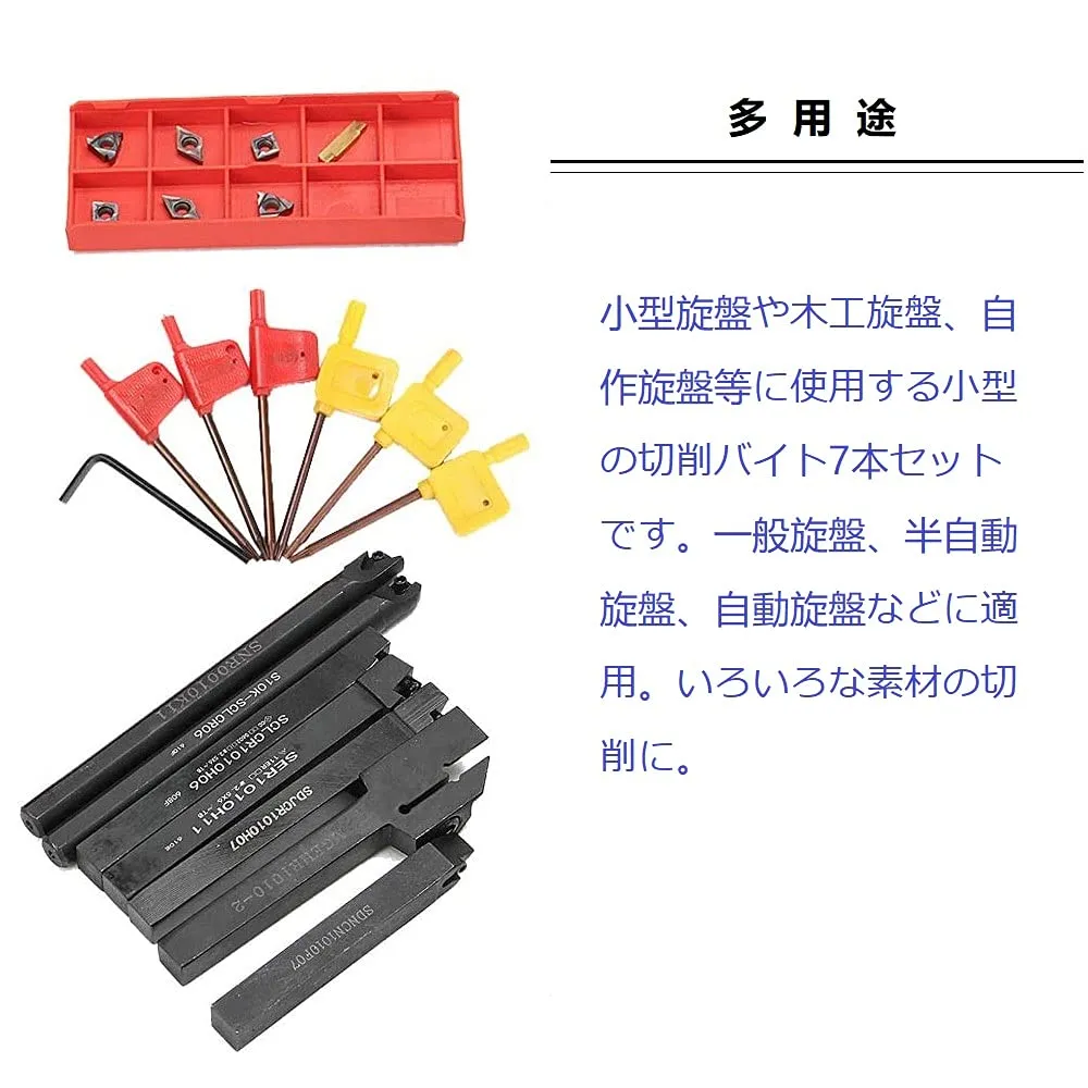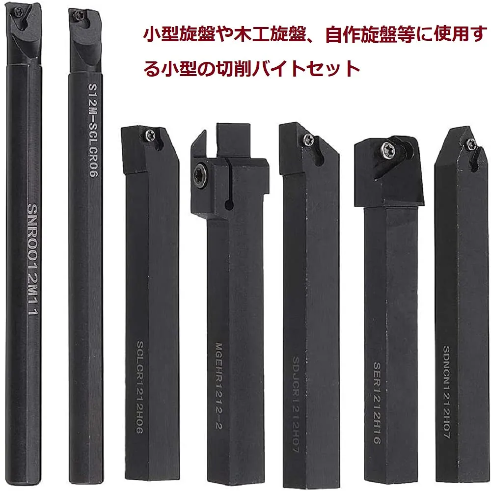 【幅広い用途】小型旋盤や木工旋盤、自作旋盤等に使用する小型の切削バイト7本セットです。一般旋盤、半自動旋盤、自動旋盤などに適用。いろいろな素材の切削に。優れた切断面構造により、鋭さを維持し、処理速度を加速できる真っ直ぐで均一な超硬インサート。